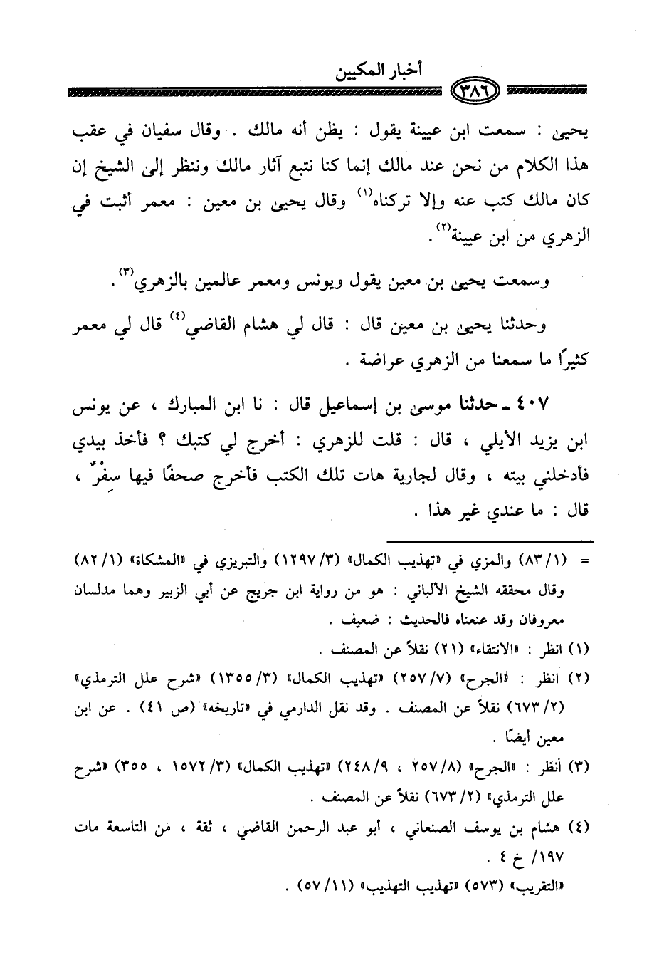 يحيى: سَمِعت ابْن عُيَيْنَة يَقُول: يظنّ أَنه مَالك. وَقَالَ سُفْيَان فِي عقب هَذَا الْكَلَام من نَحن عِنْد مَالك إِنَّمَا كُنَّا نتبع آثَار مَالك وَنَنْظُر إِلَى الشَّيْخ إِن كَانَ مَالك كتب عَنهُ وَإِلَّا تَرَكْنَاهُ وَقَالَ يحيى بن معِين: معمر أثبت فِي الزُّهْرِيّ من ابْن عُيَيْنَة.
