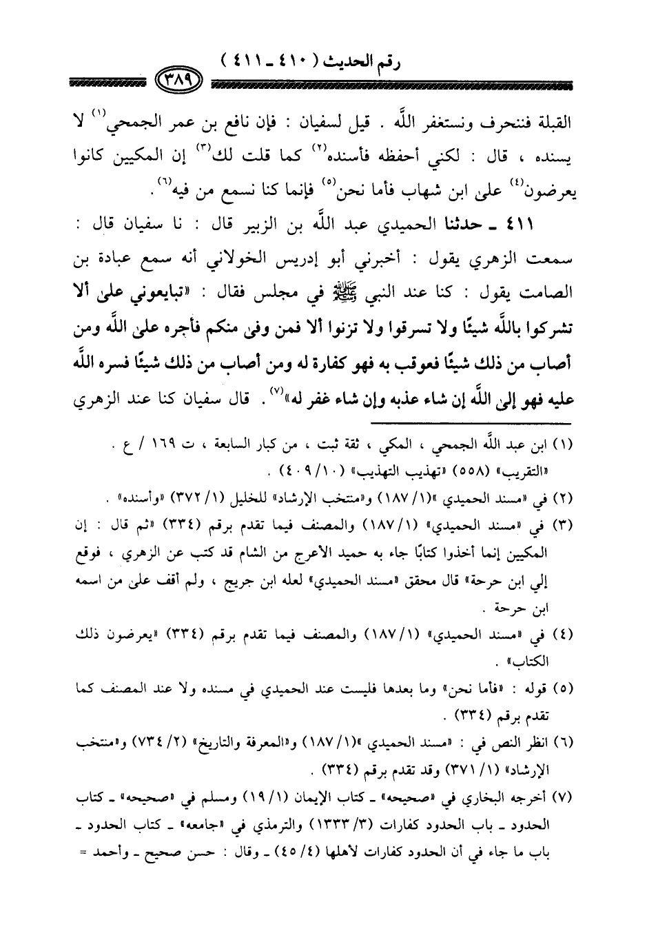 ٤١١ - حَدثنَا الْحميدِي عبد الله بن الزبير قَالَ: نَا سُفْيَان قَالَ: سَمِعت الزُّهْرِيّ يَقُول: أَخْبرنِي أَبُو إِدْرِيس الْخَولَانِيّ أَنه سمع عبَادَة بن الصَّامِت يَقُول: كُنَّا عِنْد النَّبِي صلى الله عَلَيْهِ وَسلم فِي مجْلِس فَقَالَ: " تُبَايِعُونِي على أَلا تُشْرِكُوا بِاللَّه شَيْئا وَلَا تَسْرِقُوا وَلَا تَزْنُوا أَلا فَمن وفى مِنْكُم فَأَجره على الله وَمن أصَاب من ذَلِك شَيْئا فَعُوقِبَ بِهِ فَهُوَ كَفَّارَة لَهُ وَمن أصَاب من ذَلِك شَيْئا فسره الله عَلَيْهِ فَهُوَ إِلَى الله إِن شَاءَ عذبه وَإِن شَاءَ غفر لَهُ ". قَالَ سُفْيَان كُنَّا عِنْد الزُّهْرِيّ