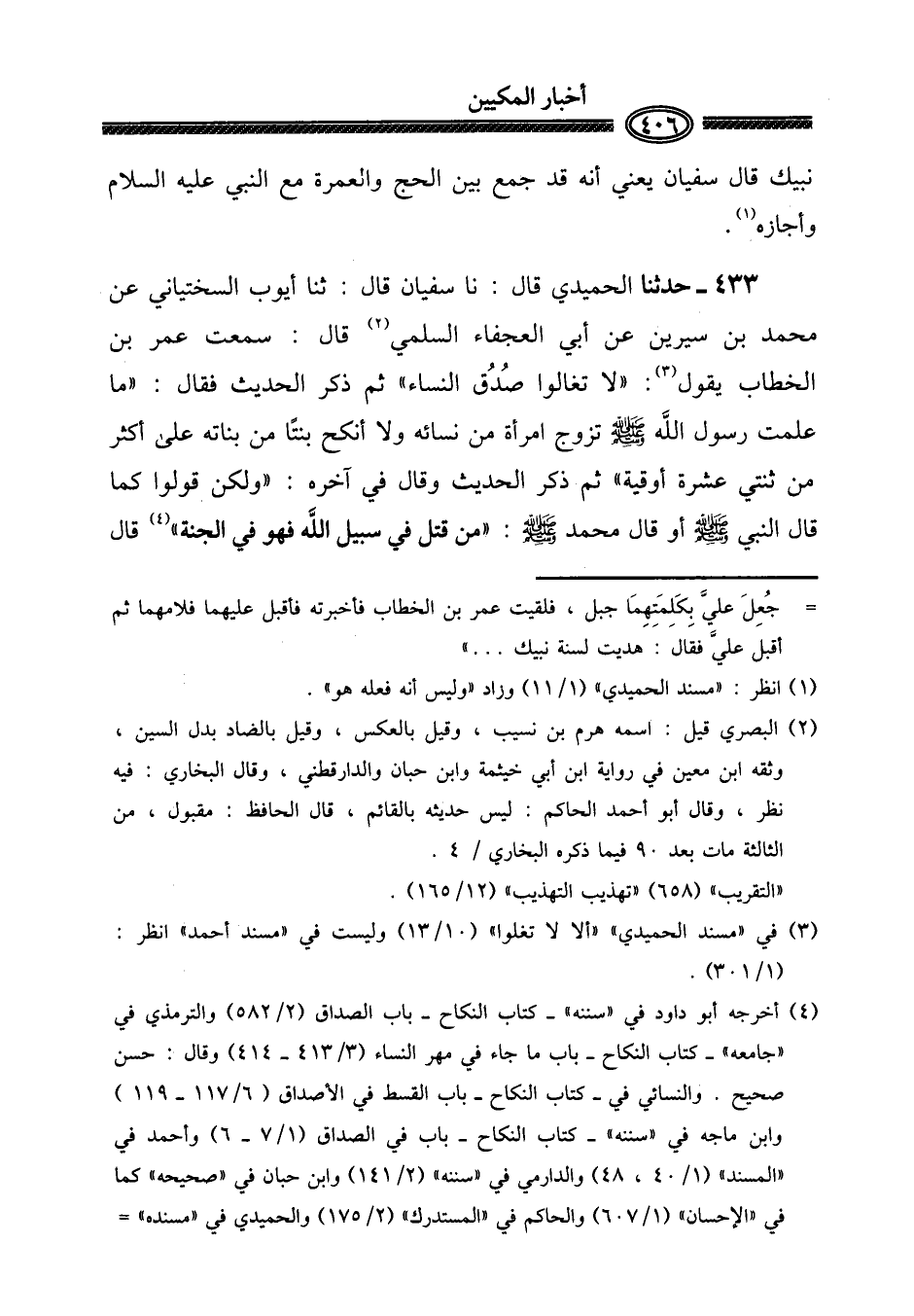 ٤٣٣ - حَدثنَا الْحميدِي قَالَ: نَا سُفْيَان قَالَ: ثَنَا أَيُّوب السّخْتِيَانِيّ عَن مُحَمَّد بن سِيرِين عَن أبي الْعَجْفَاء السّلمِيّ قَالَ: سَمِعت عمر بن الْخطاب يَقُول: " لَا تغَالوا صدق النِّسَاء " ثمَّ ذكر الحَدِيث فَقَالَ: " مَا علمت رَسُول الله صلى الله عَلَيْهِ وَسلم تزوج امْرَأَة من نِسَائِهِ وَلَا أنكح بِنْتا من بَنَاته على أَكثر من ثِنْتَيْ عشرَة أُوقِيَّة " ثمَّ ذكر الحَدِيث وَقَالَ فِي آخِره: " وَلَكِن قُولُوا كَمَا قَالَ النَّبِي صلى الله عَلَيْهِ وَسلم أَو قَالَ مُحَمَّد صلى الله عَلَيْهِ وَسلم: " من قتل فِي سَبِيل الله فَهُوَ فِي الْجنَّة " قَالَ