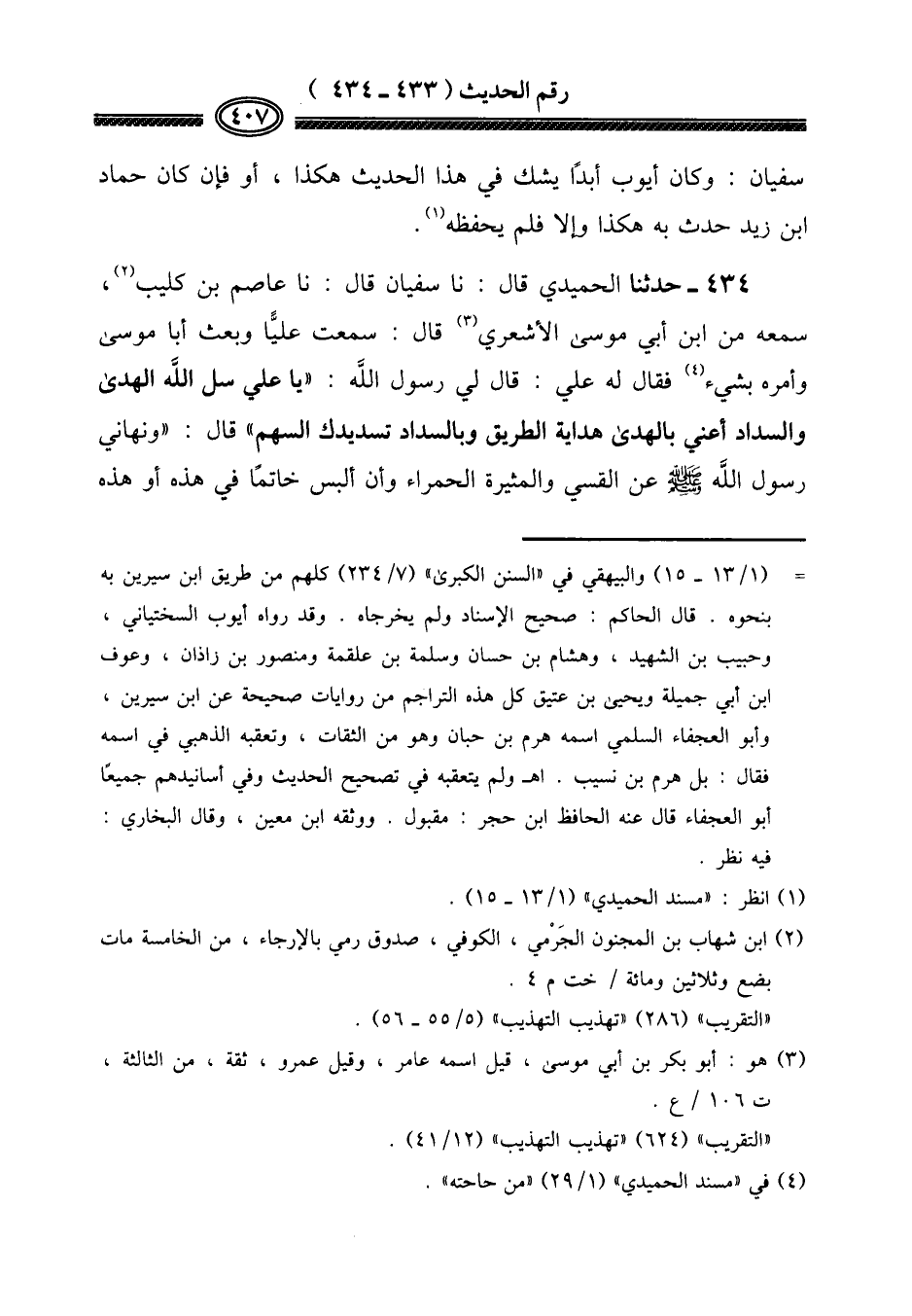 ٤٣٤ - حَدثنَا الْحميدِي قَالَ: نَا سُفْيَان قَالَ: نَا عَاصِم بن كُلَيْب، سَمعه من ابْن أبي مُوسَى الْأَشْعَرِيّ قَالَ: سَمِعت عليًّا وَبعث أَبَا مُوسَى وَأمره بِشَيْء فَقَالَ لَهُ عَليّ: قَالَ لي رَسُول الله: " يَا عَليّ سل الله الْهدى والسداد أَعنِي بِالْهدى هِدَايَة الطَّرِيق وبالسداد تسديدك السهْم " قَالَ: " ونهاني رَسُول الله صلى الله عَلَيْهِ وَسلم عَن القسي والمثيرة الْحَمْرَاء وَأَن ألبس خَاتمًا فِي هَذِه أَو هَذِه