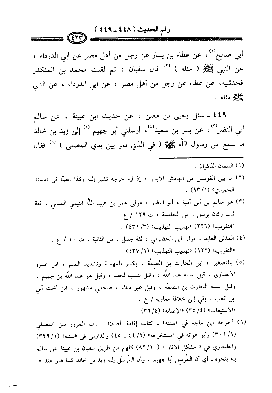 ٤٤٩ - سُئِلَ يحيى بن معِين، عَن حَدِيث ابْن عُيَيْنَة، عَن سَالم أبي النَّضر، عَن بسر بن سعيد، أَرْسلنِي أَبُو جهيم إِلَى زيد بن خَالِد مَا سمع من رَسُول الله صلى الله عَلَيْهِ وَسلم (فِي الَّذِي يمر بَين يَدي الْمُصَلِّي) فَقَالَ
