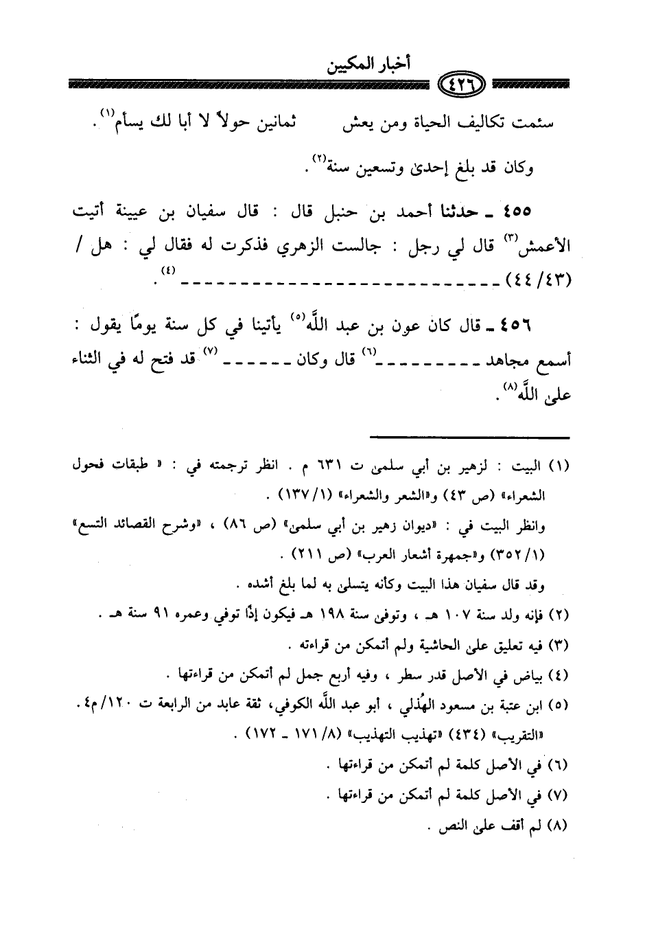 ٤٥٥ - حَدثنَا أَحْمد بن حَنْبَل قَالَ: قَالَ سُفْيَان بن عُيَيْنَة أتيت الْأَعْمَش قَالَ لي رجل: جالست الزُّهْرِيّ فَذكرت لَهُ فَقَالَ لي: هَل / (٤٣ / ٤٤) -.