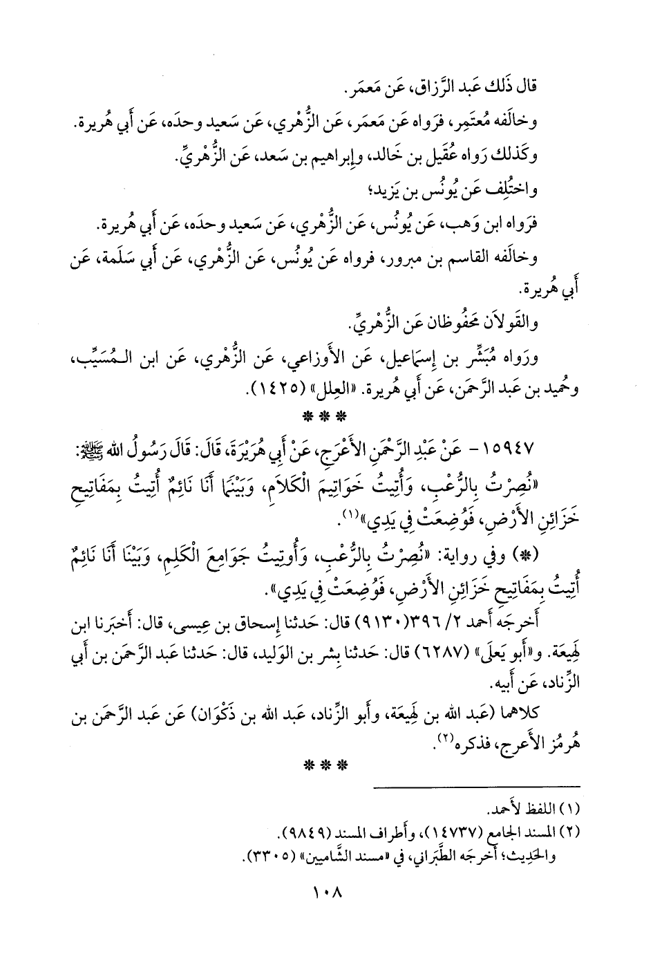 ١٥٩٤٧ - عن عبد الرَّحمَن الأعرج، عن أبي هريرة، قال: قال رسول الله صَلى الله عَليه وسَلم: