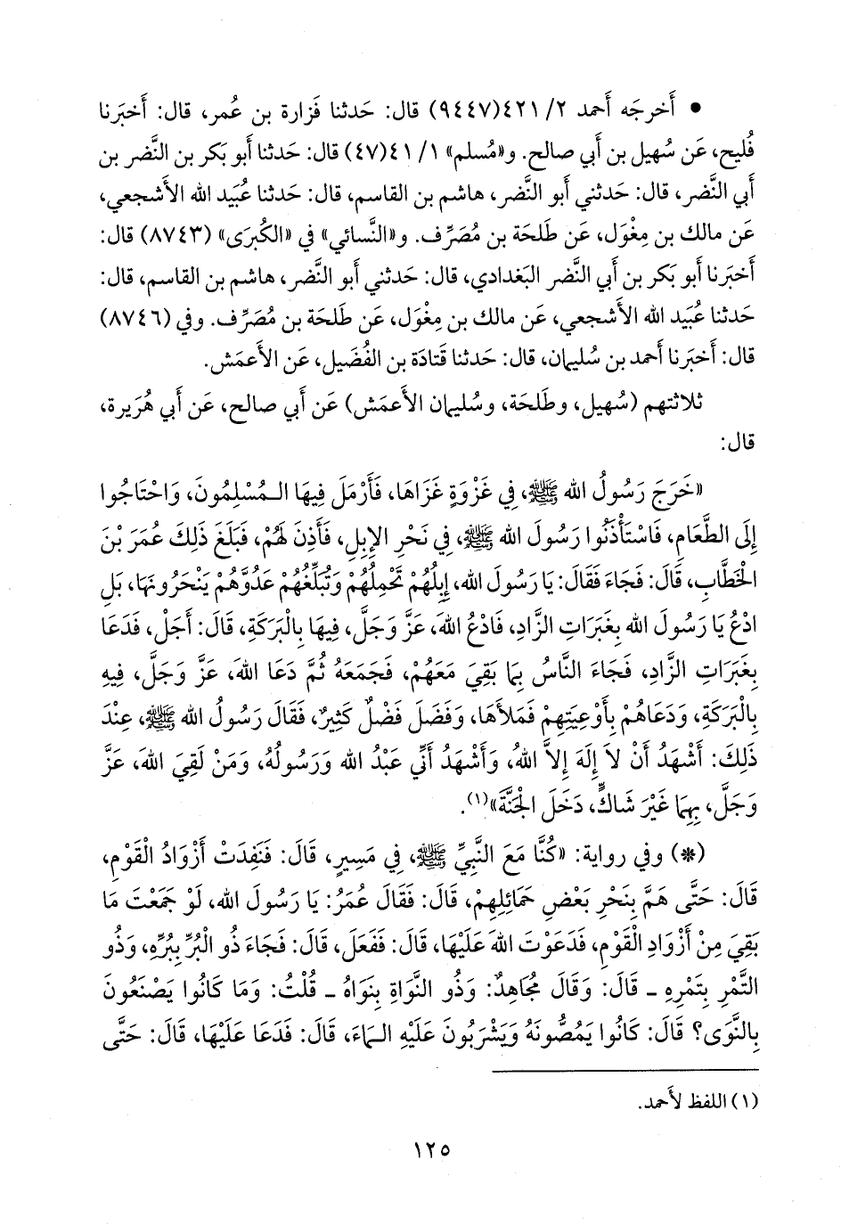 «خرج رسول الله صَلى الله عَليه وسَلم في غزوة غزاها، فأرمل فيها المسلمون، واحتاجوا إلى الطعام، فاستاذنوا رسول الله صَلى الله عَليه وسَلم في نحر الإبل، فأذن لهم، فبلغ ذلك عمر بن الخطاب، قال: فجاء فقال: يا رسول الله، إبلهم تحملهم وتبلغهم عدوهم ينحرونها، بل ادع يا رسول الله بغبرات الزاد، فادع الله، عز وجل، فيها بالبركة، قال: أجل، فدعا بغبرات الزاد، فجاء الناس بما بقي معهم، فجمعه ثم دعا الله، عز وجل، فيه بالبركة، ودعاهم بأوعيتهم فملأها، وفضل فضل كثير، فقال رسول الله صَلى الله عَليه وسَلم عند ذلك: أشهد أن لا إله إلا الله، وأشهد أني عبد الله ورسوله، ومن لقي الله، عز وجل، بهما غير شاك، دخل الجنة» (¬١).