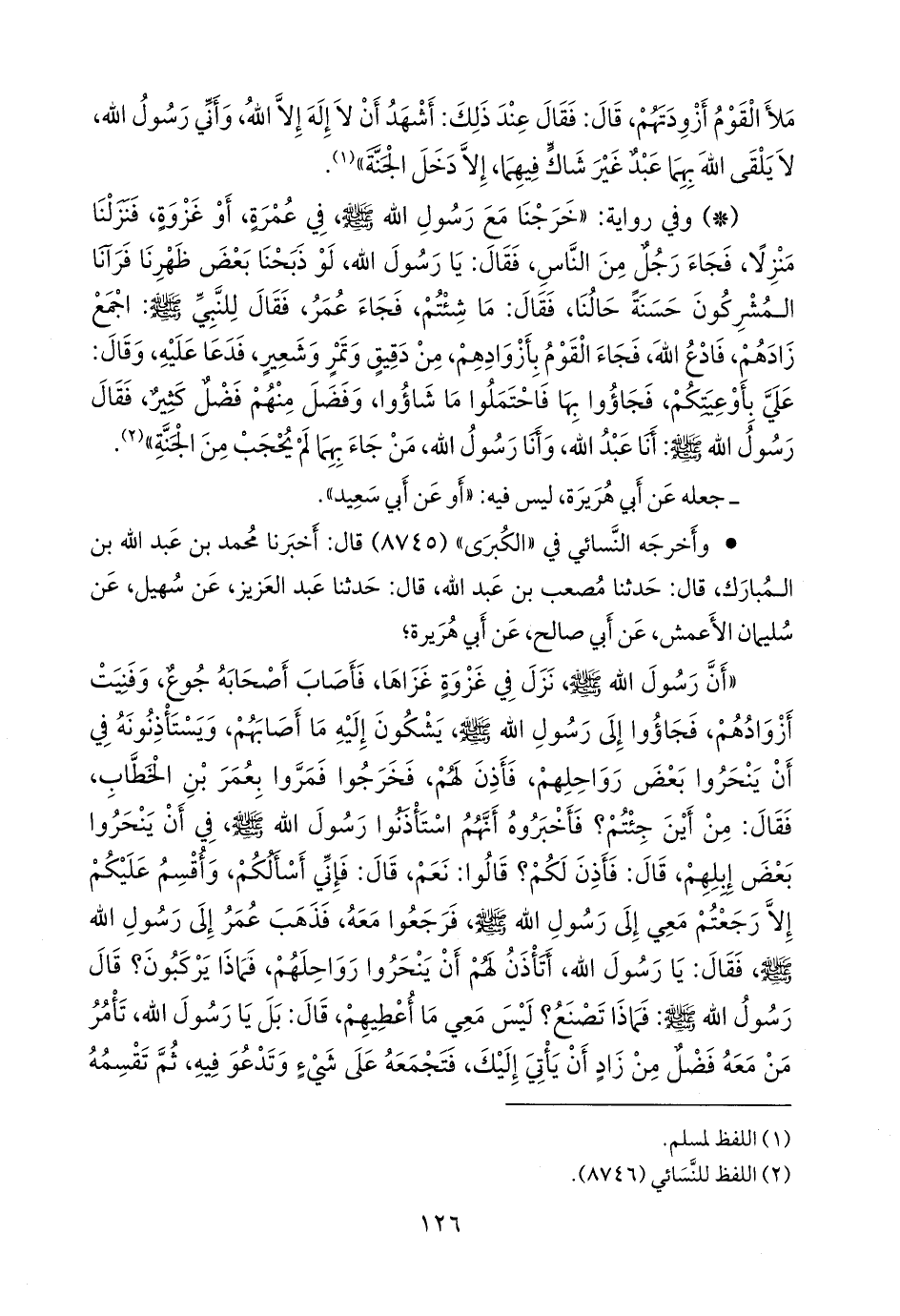 - وفي رواية: «خرجنا مع رسول الله صَلى الله عَليه وسَلم في عمرة، أو غزوة، فنزلنا منزلا، فجاء رجل من الناس، فقال: يا رسول الله، لو ذبحنا بعض ظهرنا فرأىنا المشركون حسنة حالنا، فقال: ما شئتم، فجاء عمر، فقال للنبي صَلى الله عَليه وسَلم: اجمع زادهم، فادع الله، فجاء القوم بأزوادهم، من دقيق وتمر وشعير، فدعا عليه، وقال: علي بأوعيتكم، فجاؤوا بها فاحتملوا ما شاؤوا، وفضل منهم فضل كثير، فقال رسول الله صَلى الله عَليه وسَلم: أنا عبد الله، وأنا رسول الله، من جاء بهما لم يحجب من الجنة» (¬١).