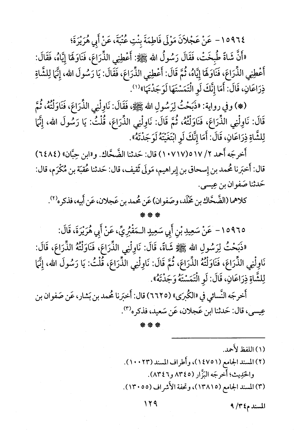 - وفي رواية: «ذبحت لرسول الله صَلى الله عَليه وسَلم فقال: ناولني الذراع، فناولته، ثم قال: ناولني الذراع، فناولته، ثم قال: ناولني الذراع، قلت: يا رسول الله، إنما للشاة ذراعان، قال: أما إنك لو ابتغيته لوجدته».