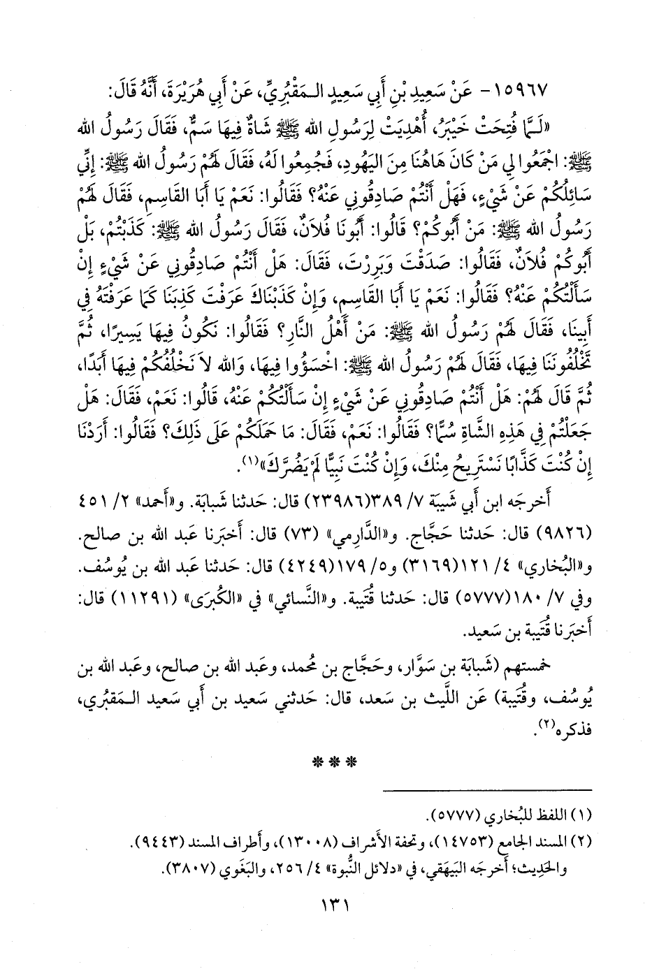 خمستهم (شبابة بن سوار، وحجاج بن محمد، وعبد الله بن صالح، وعبد الله بن يوسف، وقتيبة) عن الليث بن سعد، قال: حدثني سعيد بن أبي سعيد المَقبُري، فذكره (¬٢).