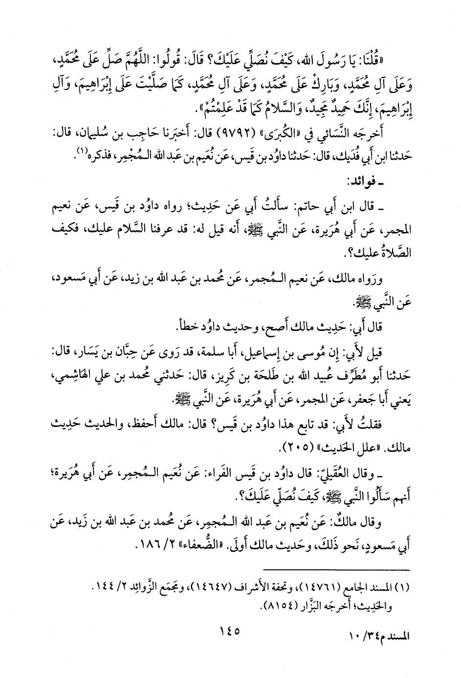 - قال عبد الرَّحمَن بن أبي حاتم الرازي: سألتُ أبي عن حديثٍ؛ رواه داود بن قيس، عن نعيم المجمر، عن أبي هريرة، عن النبي صَلى الله عَليه وسَلم أنه قيل له: قد عرفنا السلام عليك، فكيف الصلاة عليك؟.