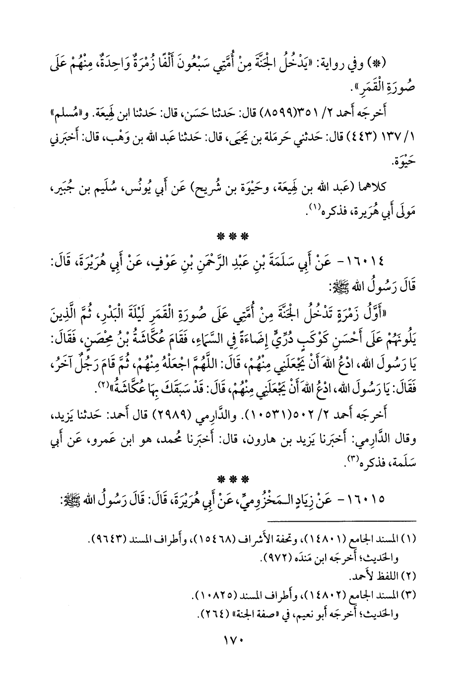 «نحن الآخرون السابقون يوم القيامة، أول زمرة من أمتي يدخلون الجنة سبعون ألفا لا حساب عليهم، صورة كل رجل منهم على صورة القمر ليلة البدر، ثم الذين يلونهم على أشد ضوء كوكب في السماء، ثم هي بعد ذلك منازل» (¬١).