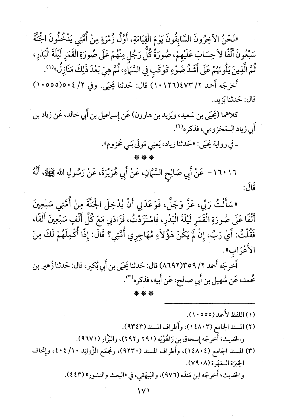 «سألت ربي، عز وجل، فوعدني أن يدخل الجنة من أمتي سبعين ألفا على صورة القمر ليلة البدر، فاستزدت، فزادني مع كل ألف سبعين ألفا، فقلت: أي رب، إن لم يكن هؤلاء مهاجري أمتي؟ قال: إذا أكملهم لك من الأعراب».