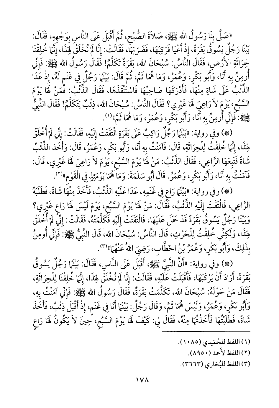 - وفي رواية: «أن النبي صَلى الله عَليه وسَلم أقبل على الناس، فقال: بينما رجل يسوق بقرة، أراد أن يركبها، فأقبلت عليه، فقالت: إنا لم نخلق لهذا، إنما خلقنا للحراثة، فقال من حوله: سبحان الله، تكلمت بقرة، فقال رسول الله صَلى الله عَليه وسَلم: فإني آمنت به، وأَبو بكر، وعمر، وليس هما ثم، وقال رجل: بينما أنا في غنم، إذ أقبل ذِئب، فأخذ شاة، فطلبتها فأخذتها منه، فقال لي: كيف لها يوم السبع، حين لا يكون لها راع