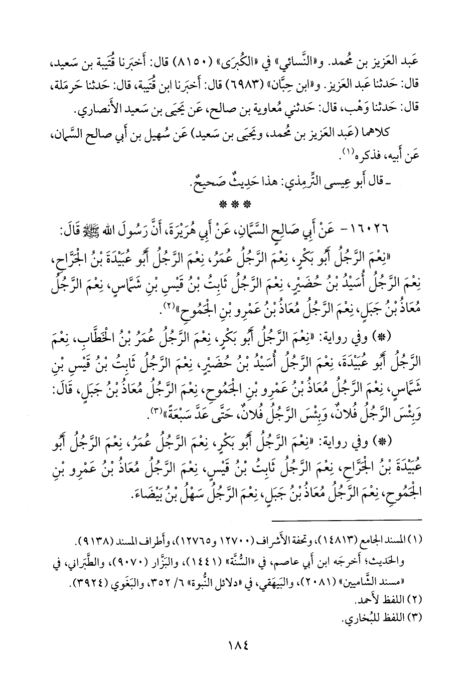 - وفي رواية: «نعم الرجل أَبو بكر، نعم الرجل عمر، نعم الرجل أَبو عُبَيدة بن الجَراح، نعم الرجل أُسيد بن حُضير، نعم الرجل ثابت بن قيس بن شماس، نعم الرجل معاذ بن عَمرو بن الجموح، بئس الرجل فلان وفلان، سماهم رسول الله صَلى الله عَليه وسَلم ولم يُسَمِّهم لنا سهيل» (¬٤).