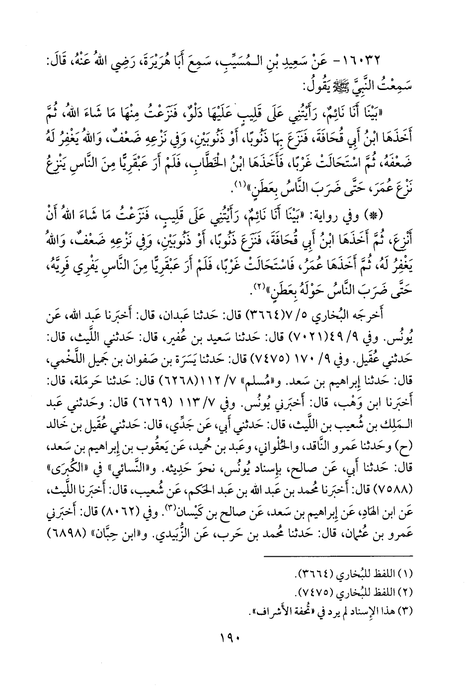 - وفي رواية: «بينا أنا نائم، رأيتني على قليب، فنزعت ما شاء الله أن أنزع، ثم أخذها ابن أبي قحافة، فنزع ذنوبا، أو ذنوبين، وفي نزعه ضعف، والله يغفر له، ثم أخذها عمر، فاستحالت غربا، فلم أر عبقريا من الناس يفري فريه، حتى ضرب الناس حوله بعطن» (¬٢).