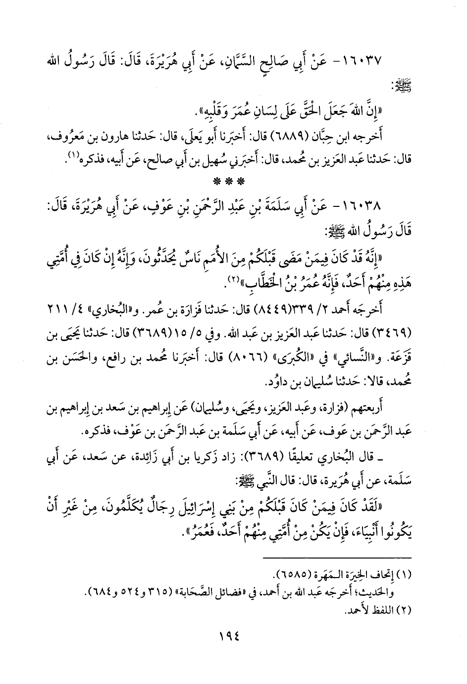 «لقد كان فيمن كان قبلكم من بني إسرائيل رجال يكلمون، من غير أن يكونوا أنبياء، فإن يكن من أمتي منهم أحد، فعمر».