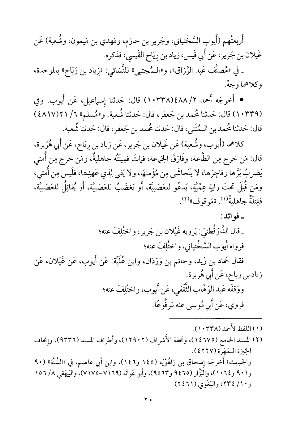 كلاهما (أيوب، وشعبة) عن غَيلان بن جرير، عن زياد بن رياح، عن أبي هريرة، قال: من خرج من الطاعة، وفارق الجماعة، فمات فميتته جاهلية، ومن خرج من أمتي يضرب برها وفاجرها، لا يتحاشى من مؤمنها، ولا يفي لذي عهدها، فليس من أمتي، ومن قتل تحت راية عمية، يدعو للعصبية، أو يغضب للعصبية، أو يقاتل للعصبية، فقتلة جاهلية (¬١). «موقوف» (¬٢).