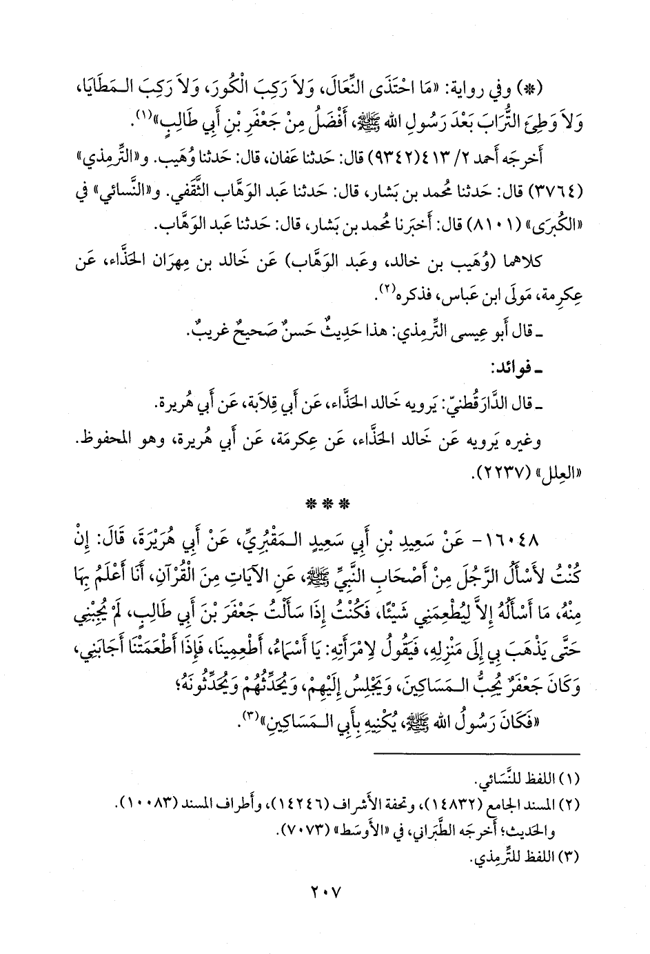 - وفي رواية: «عن المَقبُري، عن أبي هريرة، قال: كان جعفر بن أبي طالب يحب المساكين، ويجلس إليهم، ويحدثهم ويحدثونه، وكان رسول الله صَلى الله عَليه وسَلم يكنيه أبا المساكين».