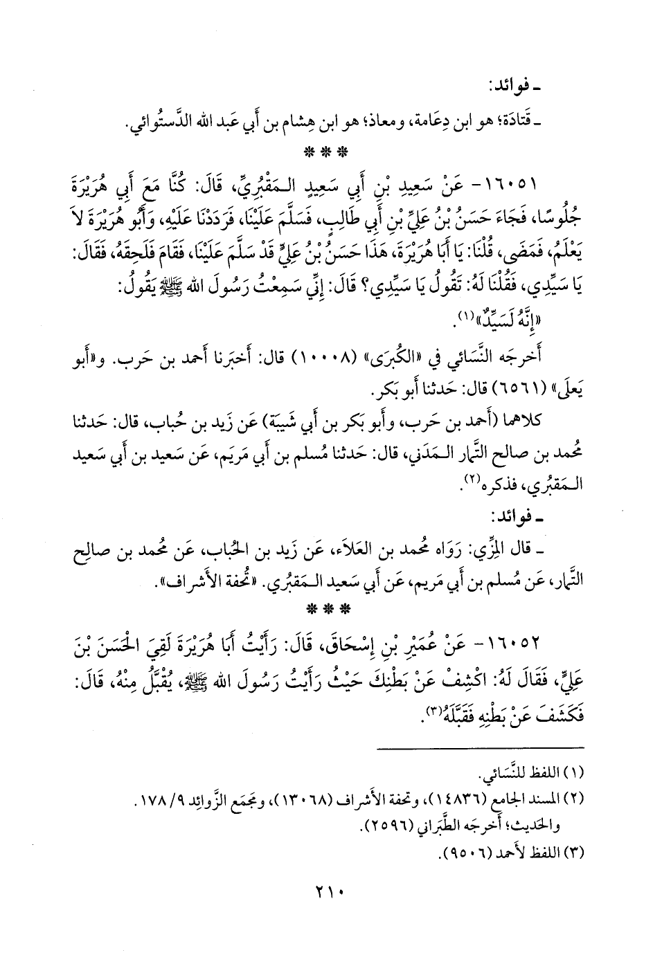 ١٦٠٥١ - عن سعيد بن أبي سعيد المَقبُري، قال: كنا مع أبي هريرة جلوسا، فجاء حسن بن علي بن أبي طالب، فسلم علينا، فرددنا عليه، وأَبو هريرة لا يعلم، فمضى، قلنا: يا أبا هريرة، هذا حسن بن علي قد سلم علينا، فقام فلحقه، فقال: يا سيدي، فقلنا له: تقول يا سيدي؟ قال: إني سمعت رسول الله صَلى الله عَليه وسَلم يقول: