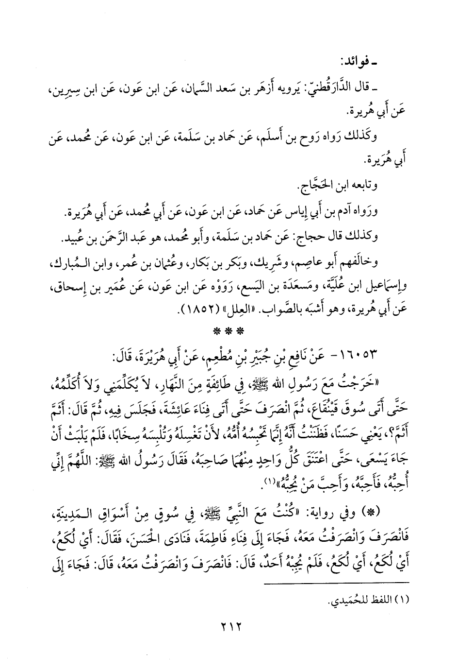 «خرجت مع رسول الله صَلى الله عَليه وسَلم في طائفة من النهار، لا يكلمني ولا أكلمه، حتى أتى سوق قينقاع، ثم انصرف حتى أتى فناء عائشة، فجلس فيه، ثم قال: أثم أثم؟، يعني حسنا، فظننت أنه إنما تحبسه أمه، لأن تغسله وتلبسه سخابا، فلم يلبث أن جاء يسعى، حتى اعتنق كل واحد منهما صاحبه، فقال رسول الله صَلى الله عَليه وسَلم: اللهم إني أحبه، فأحبه، وأحب من يحبه» (¬١).