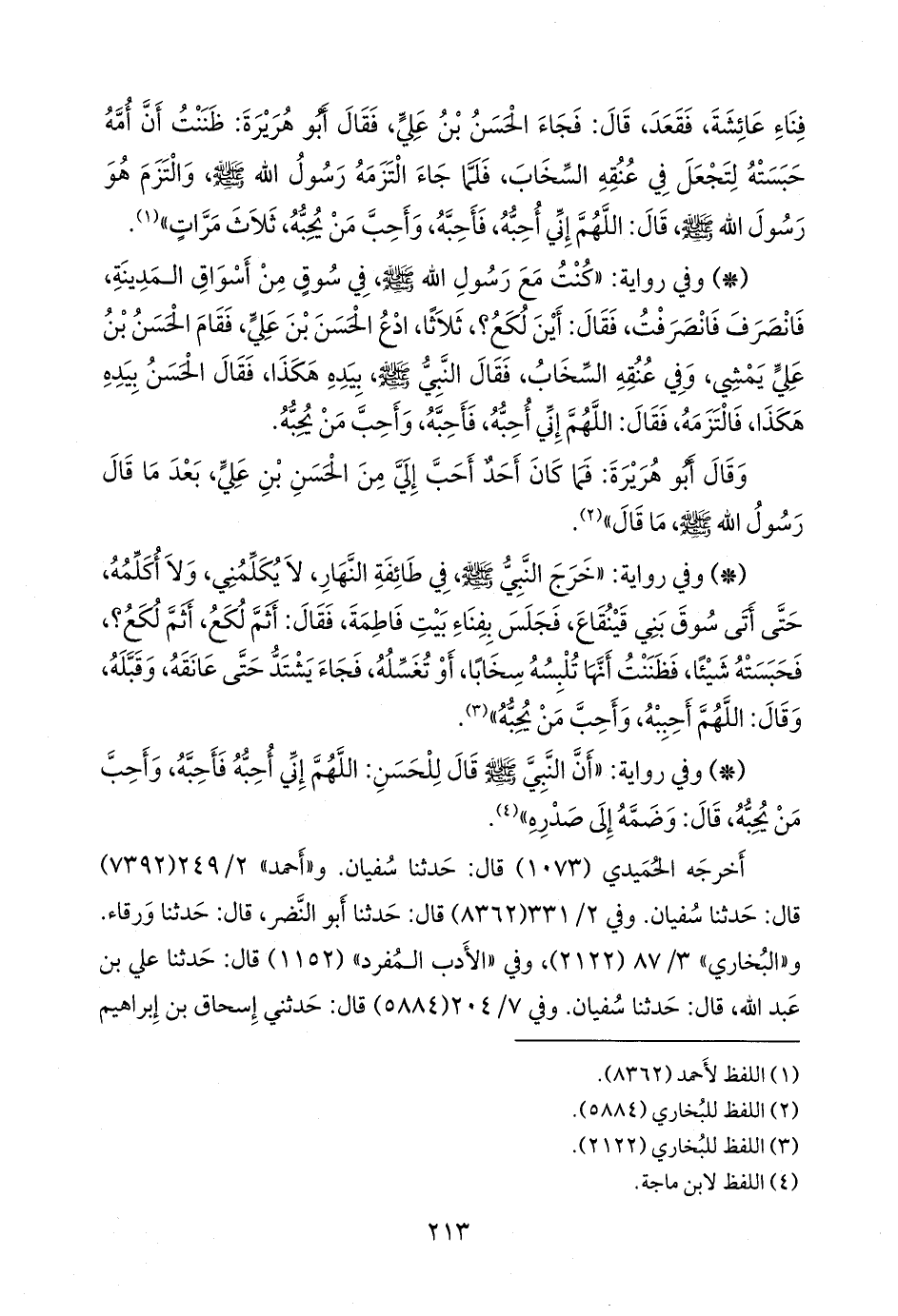 - وفي رواية: «خرج النبي صَلى الله عَليه وسَلم في طائفة النهار، لا يكلمني، ولا أكلمه، حتى أتى سوق بني قينقاع، فجلس بفناء بيت فاطمة، فقال: أثم لكع، أثم لكع؟، فحبسته شيئا، فظننت أنها تلبسه سخابا، أو تغسله، فجاء يشتد حتى عانقه، وقبله، وقال: اللهم أحببه، وأحب من يحبه» (¬٢).