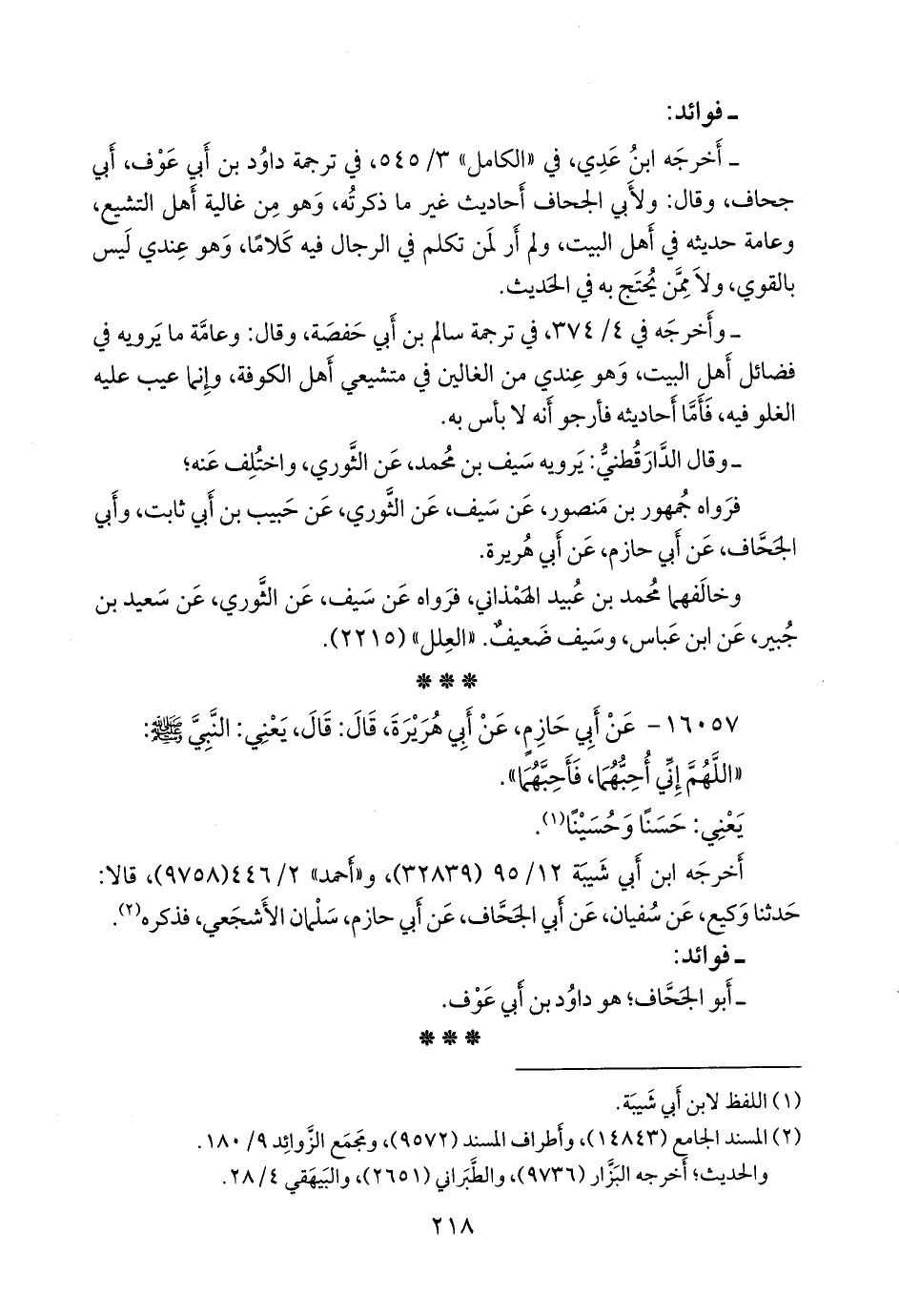 - أخرجه ابن عَدي في «الكامل» ٣/ ٥٤٥، في مناكير داود بن أبي عوف أبي جحاف، وقال: ولأبي الجحاف أحاديث غير ما ذكرته، وهو من غالية أهل التشيع، وعامة حديثه في أهل البيت، ولم أر لمن تكلم في الرجال فيه كلاما، وهو عندي ليس بالقوي، ولا ممن يحتج به في الحديث.