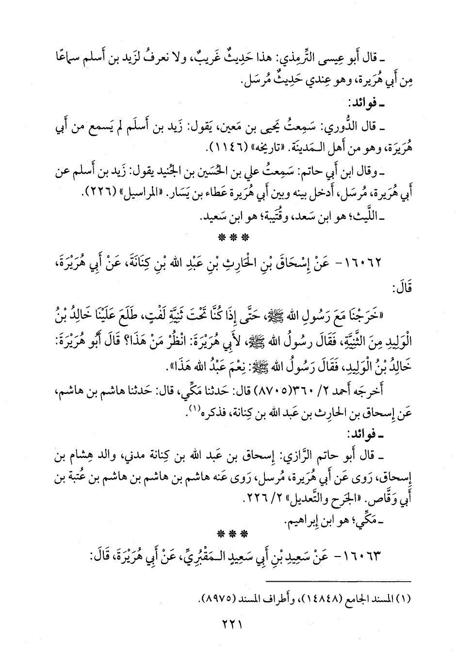 - وقال ابن أبي حاتم: سمعت علي بن الحسين بن الجنيد يقول: زيد بن أسلم عن أبي هريرة، مرسل، أدخل بينه وبين أبي هريرة عطاء بن يسار. «المراسيل» (٢٢٦).