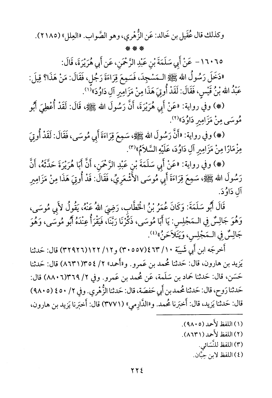 «أن رسول الله صَلى الله عَليه وسَلم كان يقول لأبي موسى، وكان حسن الصوت بالقرآن: لقد أوتي هذا من مزامير آل داود»، «مُرسَل».