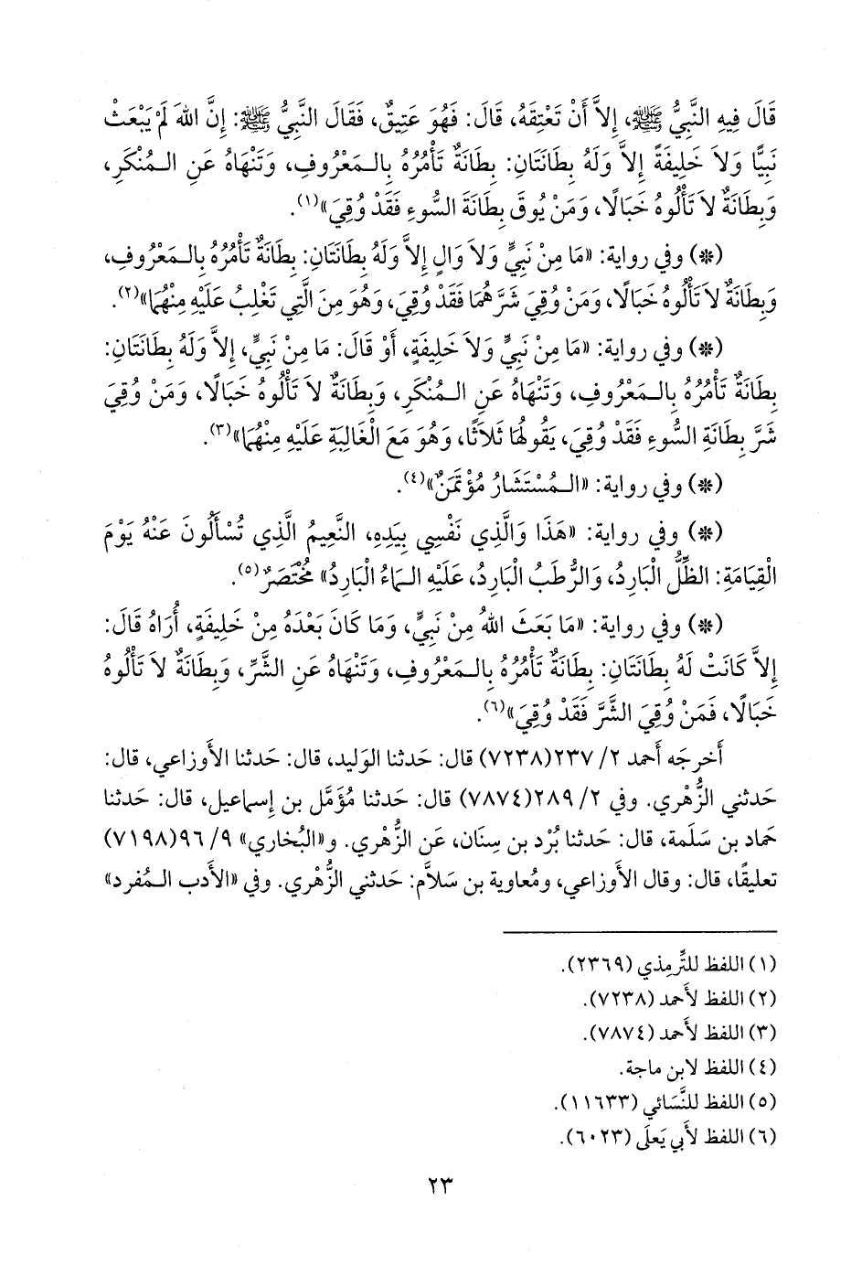 - وفي رواية: «ما بعث الله من نبي، وما كان بعده من خليفة، أراه قال: إلا كانت له بطانتان: بطانة تامره بالمعروف، وتنهاه عن الشر، وبطانة لا تالوه خبالا، فمن وقي الشر فقد وقي» (¬٥).