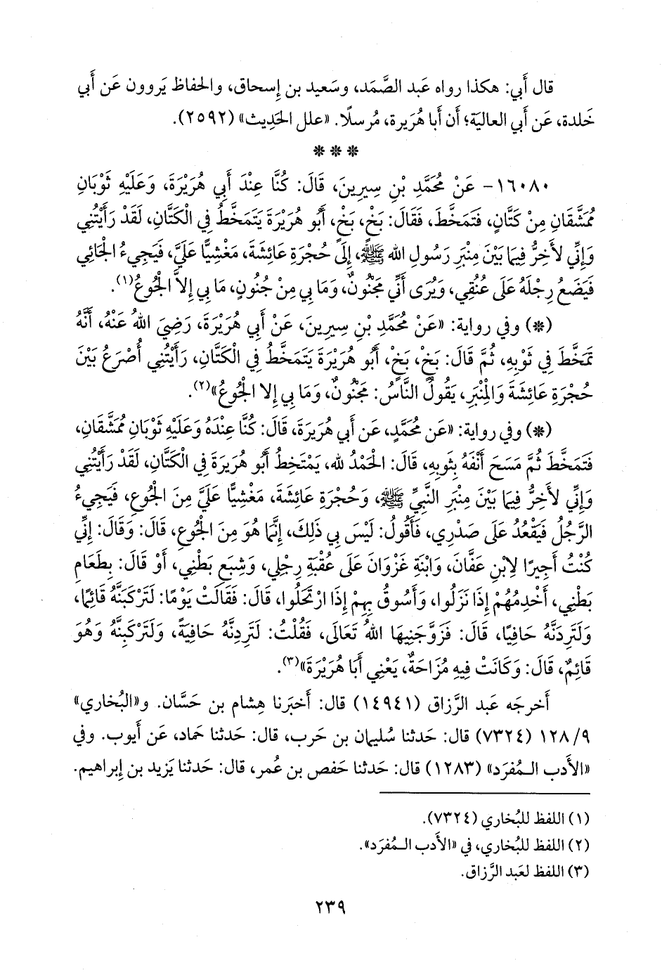 - وفي رواية: «عن محمد، عن أبي هريرة، قال: كنا عنده وعليه ثوبان ممشقان، فتمخط ثم مسح أنفه بثوبه، قال: الحمد لله، يمتخط أَبو هريرة في الكَتان، لقد رأيتني وإني لأخر فيما بين منبر النبي صَلى الله عَليه وسَلم وحجرة عائشة، مغشيا علي من الجوع، فيجيء الرجل فيقعد على صدري، فأقول: ليس بي ذلك، إنما هو من الجوع، قال: وقال: إني كنت أجيرا لابن عفان، وابنة غزوان على عقبة رجلي، وشبع بطني، أو قال: بطعام بطني، أخدمهم إذا نزلوا، وأسوق بهم إذا ارتحلوا، قال: فقالت يوما: لتركبنه قائما، ولتردنه حافيا، قال: فزوجنيها الله تعالى، فقلت: لتردنه حافية، ولتركبنه وهو قائم، قال: وكانت فيه مزاحة، يعني أبا هريرة» (¬٣).