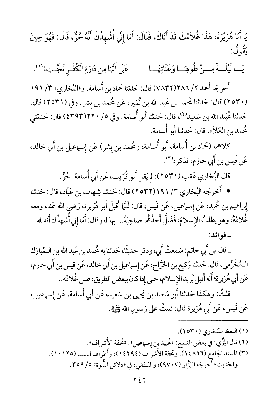 - قال ابن أبي حاتم: سمعت أبي، وذكر حديثا، حدثنا به محمد بن عبد الله بن المبارك المخرمي، قال: حدثنا وكيع بن الجراح، عن إسماعيل بن أبي خالد، عن قيس بن أبي حازم، عن أبي هريرة؛ أنه أقبل يريد الإسلام، حتى إذا كان ببعض الطريق، ضل غلامه ...