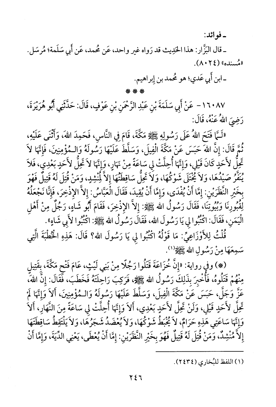 «لما فتح الله على رسوله صَلى الله عَليه وسَلم مكة، قام في الناس، فحمد الله، وأثنى عليه، ثم قال: إن الله حبس عن مكة الفيل، وسلط عليها رسوله والمؤمنين، فإنها لا تحل لأحد كان قبلي، وإنها أحلت لي ساعة من نهار، وإنها لا تحل لأحد بعدي، فلا ينفر صيدها، ولا يختلى شوكها، ولا تحل ساقطتها إلا لمنشد، ومن قتل له قتيل فهو بخير النظرين: إما أن يفدى، وإما أن يقيد، فقال العباس: إلا الإذخر، فإنا نجعله لقبورنا وبيوتنا، فقال رسول الله صَلى الله عَليه وسَلم: إلا الإذخر، فقام أَبو شاه، رجل من أهل اليمن، فقال: اكتبوا لي يا رسول الله، فقال رسول الله صَلى الله عَليه وسَلم: اكتبوا لأبي شاه».