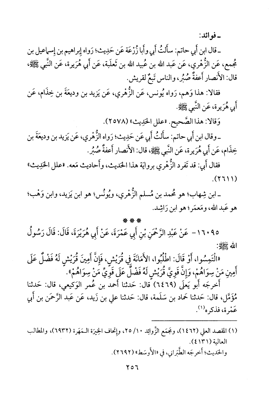 - قال عبد الرَّحمَن بن أبي حاتم الرازي: سألت أبي وأَبا زُرعَة عن حديث؛ رواه إبراهيم بن إسماعيل بن مجمع، عن الزُّهْري، عن عبد الله بن عُبيد الله بن ثعلبة، عن أبي هريرة، عن النبي صَلى الله عَليه وسَلم قال: الأنصار أعفة صبر، والناس تبع لقريش.