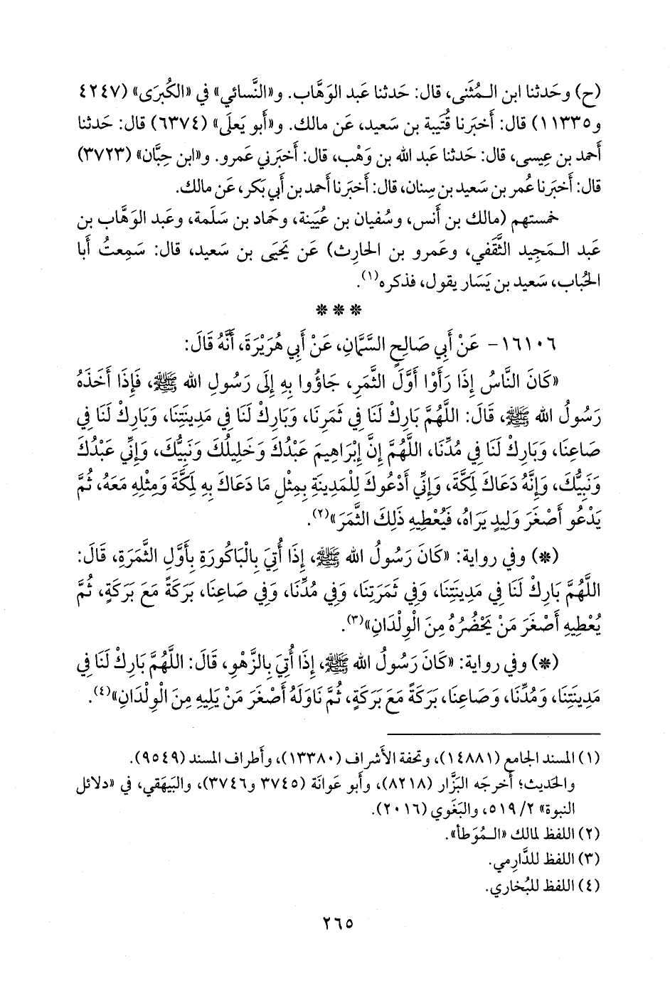 - وفي رواية: «كان رسول الله صَلى الله عَليه وسَلم إذا أتي بالباكورة بأول الثمرة، قال: اللهم بارك لنا في مدينتنا، وفي ثمرتنا، وفي مدنا، وفي صاعنا، بركة مع بركة، ثم يعطيه أصغر من يحضره من الولدان» (¬٢).