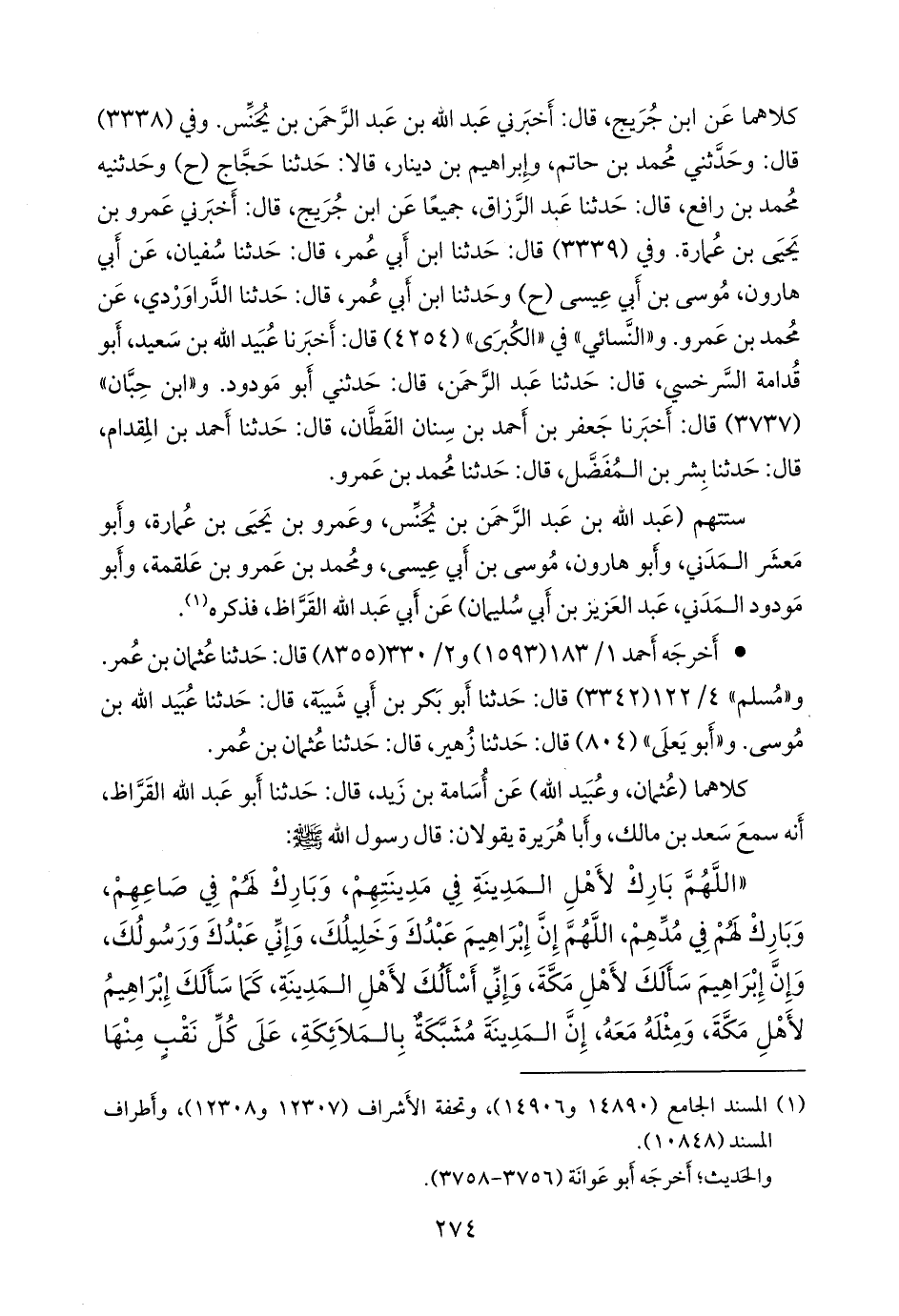 «اللهم بارك لأهل المدينة في مدينتهم، وبارك لهم في صاعهم، وبارك لهم في مدهم، اللهم إن إبراهيم عبدك وخليلك، وإني عبدك ورسولك، وإن إبراهيم سألك لأهل مكة، وإني أسألك لأهل المدينة، كما سألك إبراهيم لأهل مكة، ومثله معه، إن المدينة مشبكة بالملائكة، على كل نقب منها