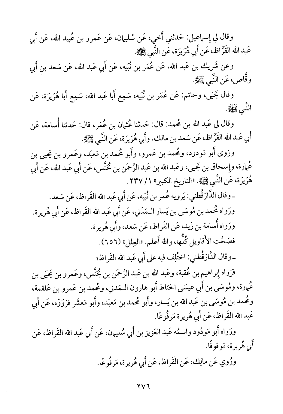 وقيل: عن أَبي بكر الحنفي، عن أسامة بن زيد، عن القراظ، عن أبي هريرة، وسعيد بن العاص، وذلك وهم من راويه، وإنما هو عن أبي هريرة، وسعد بن أبي وقاص. «العلل» (١٥٦١).