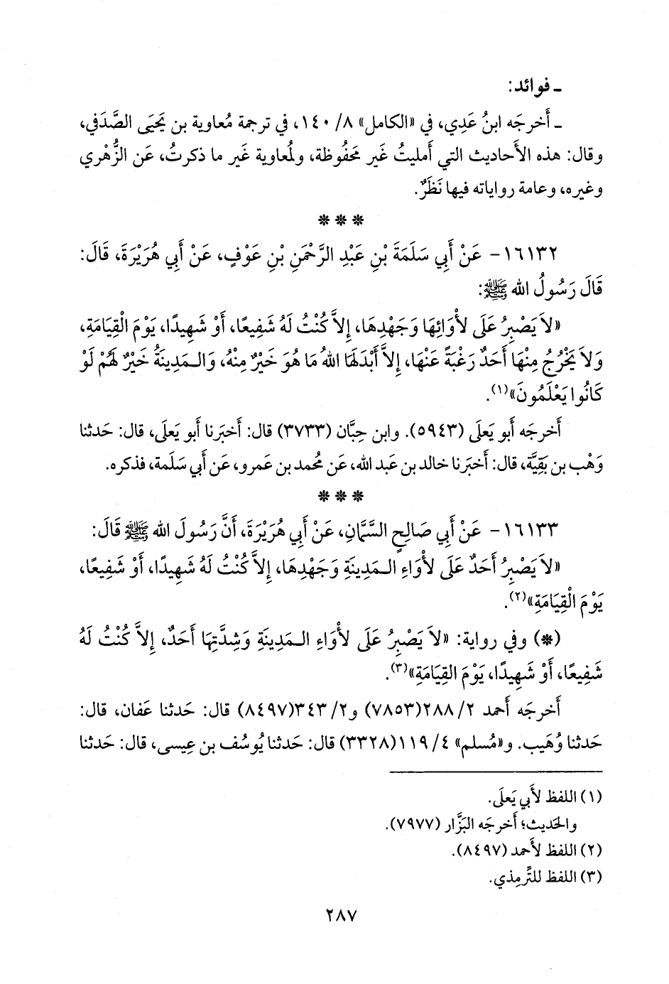 - وفي رواية: «لا يصبر على لاواء المدينة وشدتها أحد، إلا كنت له شفيعا، أو شهيدا، يوم القيامة» (¬٢).