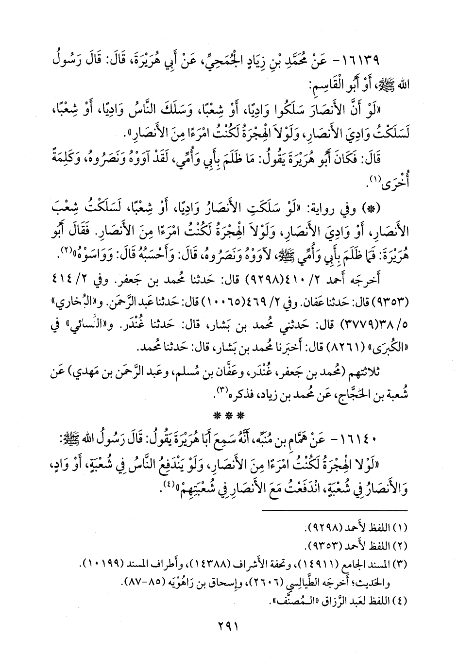 - وفي رواية: «لو سلكت الأنصار واديا، أو شعبا، لسلكت شعب الأنصار، أو وادي الأنصار، ولولا الهجرة لكنت امرءا من الأنصار. فقال أَبو هريرة: فما ظلم بأبي وأمي صَلى الله عَليه وسَلم لآووه ونصروه، قال: وأحسبه قال: وواسوه» (¬٢).