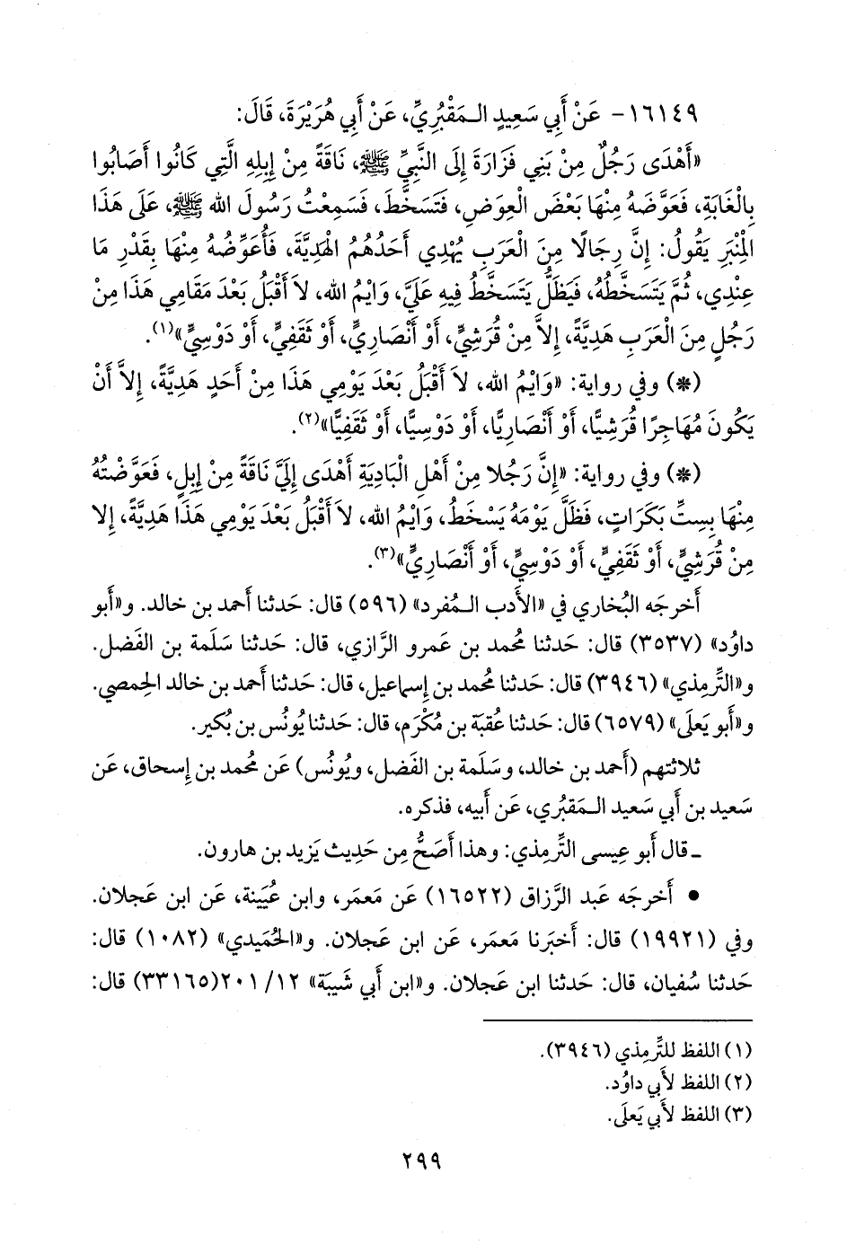 - وفي رواية: «إن رجلا من أهل البادية أهدى إلي ناقة من إبل، فعوضته منها بست بكرات، فظل يومه يسخط، وايم الله، لا أقبل بعد يومي هذا هدية، إلا من قرشي، أو ثقفي، أو دوسي، أو أنصاري» (¬٣).