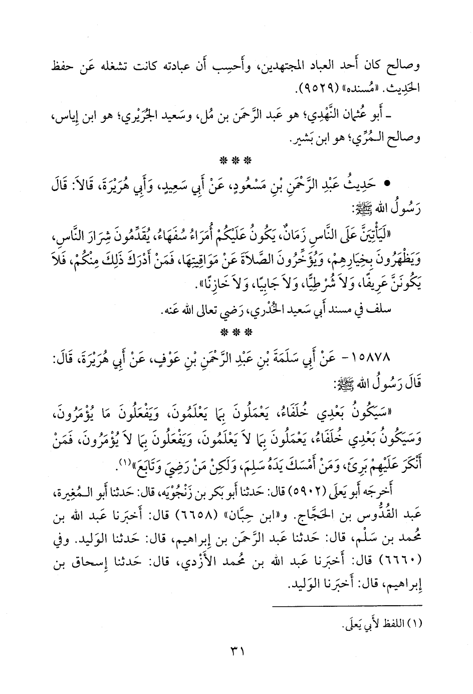 «سيكون بعدي خلفاء، يعملون بما يعلمون، ويفعلون ما يؤمرون، وسيكون بعدي خلفاء، يعملون بما لا يعلمون، ويفعلون بما لا يؤمرون، فمن أنكر عليهم برئ، ومن أمسك يده سلم، ولكن من رضي وتابع» (¬١).