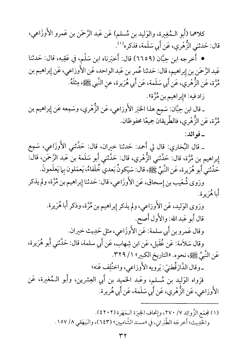- قال ابن حبان: سمع هذا الخبر الأوزاعي، عن الزُّهْري، وسمعه عن إبراهيم بن مُرَّة، عن الزُّهْري، فالطريقان جميعا محفوظان.