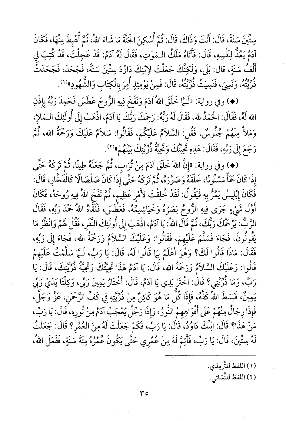 - وفي رواية: «إن الله خلق آدم من تراب، ثم جعله طينا، ثم تركه حتى إذا كان حمأ مسنونا، خلقه وصوره، ثم تركه حتى إذا كان صلصالا كالفخار، قال: فكان إبليس يمر به فيقول: لقد خلقت لأمر عظيم، ثم نفخ الله فيه من روحه، فكان أول شيء جرى فيه الروح بصره وخياشيمه، فعطس، فلقاه الله حمد ربه، فقال الرب: يرحمك ربك، ثم قال الله: يا آدم، اذهب إلى أولئك النفر، فقل لهم وانظر ما يقولون، فجاء فسلم عليهم، فقالوا: وعليك السلام ورحمة الله، فجاء إلى ربه، فقال: ماذا قالوا لك؟ وهو أعلم بما قالوا له، قال: يا رب، لما سلمت عليهم قالوا: وعليك السلام ورحمة الله، قال: يا آدم هذا تحيتك وتحية ذريتك، قال: يا رب، وما ذريتي؟ قال: اختر يدي يا آدم، قال: أختار يمين ربي، وكلتا يدي ربي يمين، فبسط الله كفه، فإذا كل ما هو كائن من ذريته في كف الرَّحمَن، عز وجل، فإذا رجال منهم على أفواههم النور، وإذا رجل يعجب آدم من نوره، قال: يا رب، من هذا؟ قال: ابنك داود، قال: يا رب، فكم جعلت له من العمر؟ قال: جعلت له ستين، قال: يا رب، فأتم له من عمري حتى يكون عمره مئة سنة، ففعل الله،