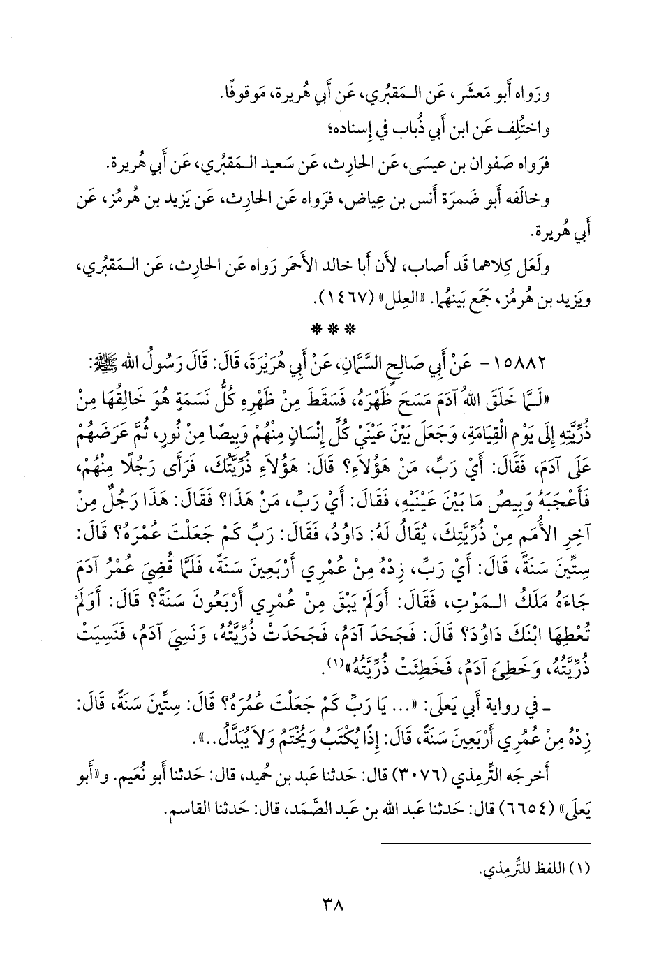 «لما خلق الله آدم مسح ظهره، فسقط من ظهره كل نسمة هو خالقها من ذريته إلى يوم القيامة، وجعل بين عيني كل إنسان منهم وبيصا من نور، ثم عرضهم على آدم، فقال: أي رب، من هؤلاء؟ قال: هؤلاء ذريتك، فرأى رجلا منهم، فأعجبه وبيص ما بين عينيه، فقال: أي رب، من هذا؟ فقال: هذا رجل من آخر الأمم من ذريتك، يقال له: داود، فقال: رب كم جعلت عمره؟ قال: ستين سنة، قال: أي رب، زده من عمري أربعين سنة، فلما قضي عمر آدم جاءه ملك الموت، فقال: أولم يبق من عمري أربعون سنة؟ قال: أولم تعطها ابنك داود؟ قال: فجحد آدم، فجحدت ذريته، ونسي آدم، فنسيت ذريته، وخطئ آدم، فخطئت ذريته» (¬١).