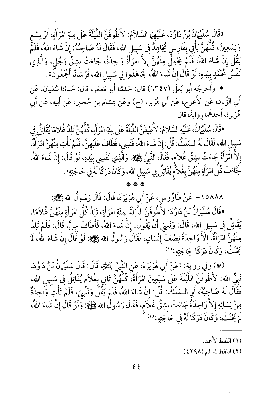 - وفي رواية: «عن أبي هريرة، عن النبي صَلى الله عَليه وسَلم قال: قال سليمان بن داود، نبي الله: لأطوفن الليلة على سبعين امرأة، كلهن تاتي بغلام يقاتل في سبيل الله، فقال له صاحبه، أو الملك: قل: إن شاء الله، فلم يقل ونسي، فلم تات واحدة من نسائه إلا واحدة جاءت بشق غلام، فقال رسول الله صَلى الله عَليه وسَلم: ولو قال إن شاء الله، لم يحنث، وكان دركا له في حاجته» (¬٢).