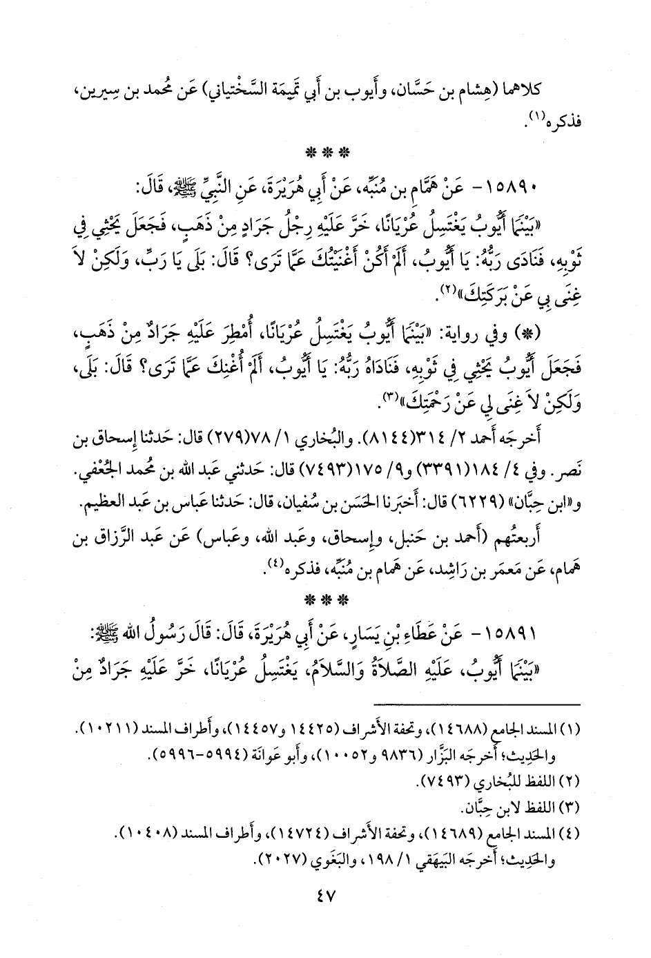 - وفي رواية: «بينما أيوب يغتسل عريانا، أمطر عليه جراد من ذهب، فجعل أيوب يحثي في ثوبه، فناداه ربه: يا أيوب، ألم أغنك عما ترى؟ قال: بلى، ولكن لا غنى لي عن رحمتك» (¬٢).