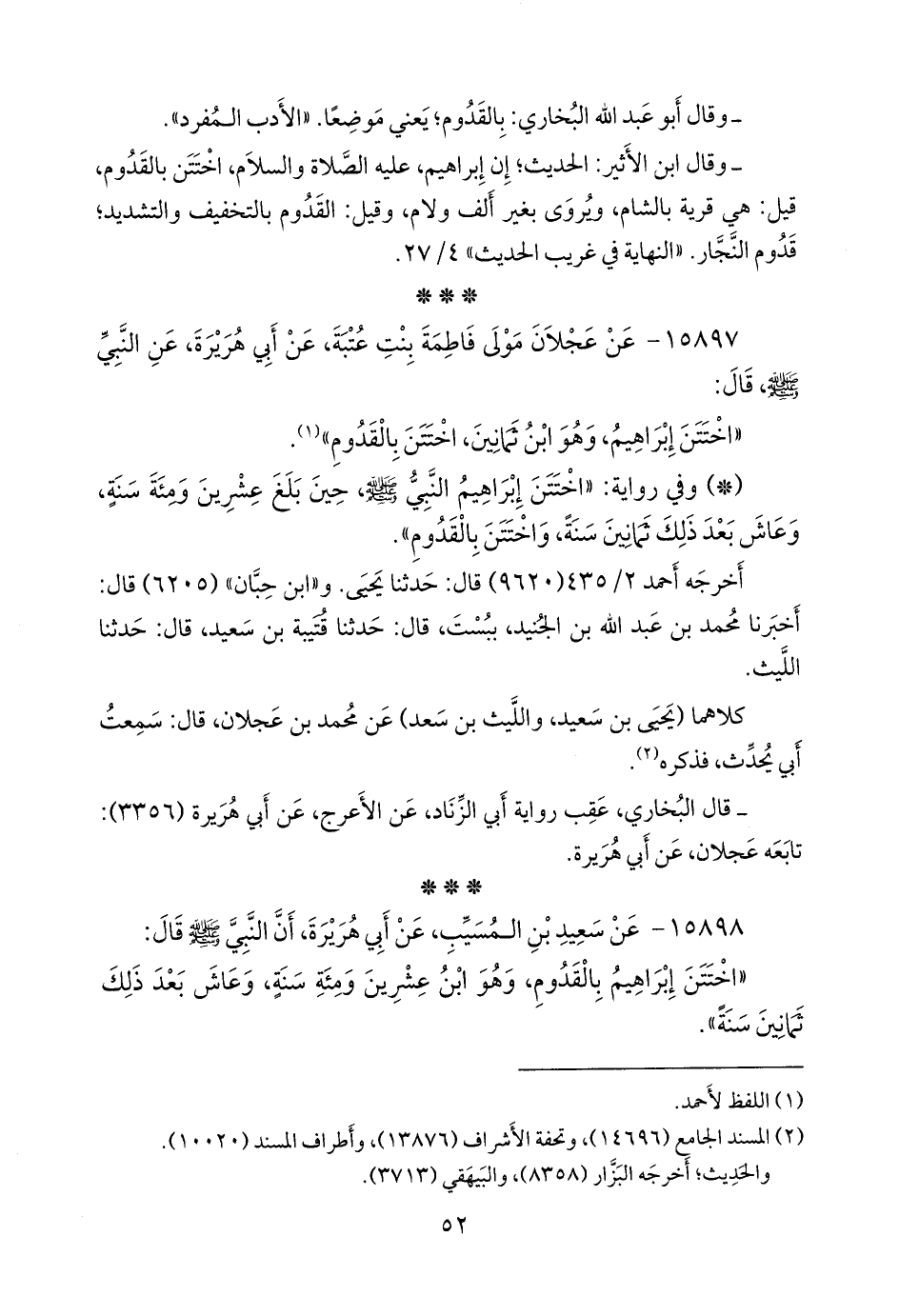 كلاهما (عبدة، وحماد) عن يحيى بن سعيد، عن سعيد بن المُسَيب، عن أبي هريرة؛ أن إبراهيم اختتن بالقدوم، وهو ابن مئة وعشرين سنة، ثم عاش بعد ذلك ثمانين سنة (¬١).