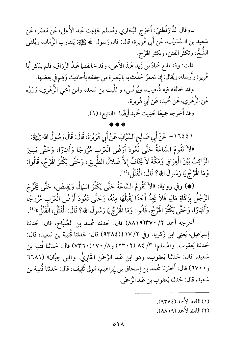 - وفي رواية: «لا تقوم الساعة حتى يكثر المال ويفيض، حتى يخرج الرجل بزكاة ماله فلا يجد أحدا يقبلها منه، وحتى تعود أرض العرب مروجا وأنهارا، وحتى يكثر الهرج، قالوا: وما الهرج يا رسول الله؟ قال: القتل، القتل» (¬٢).