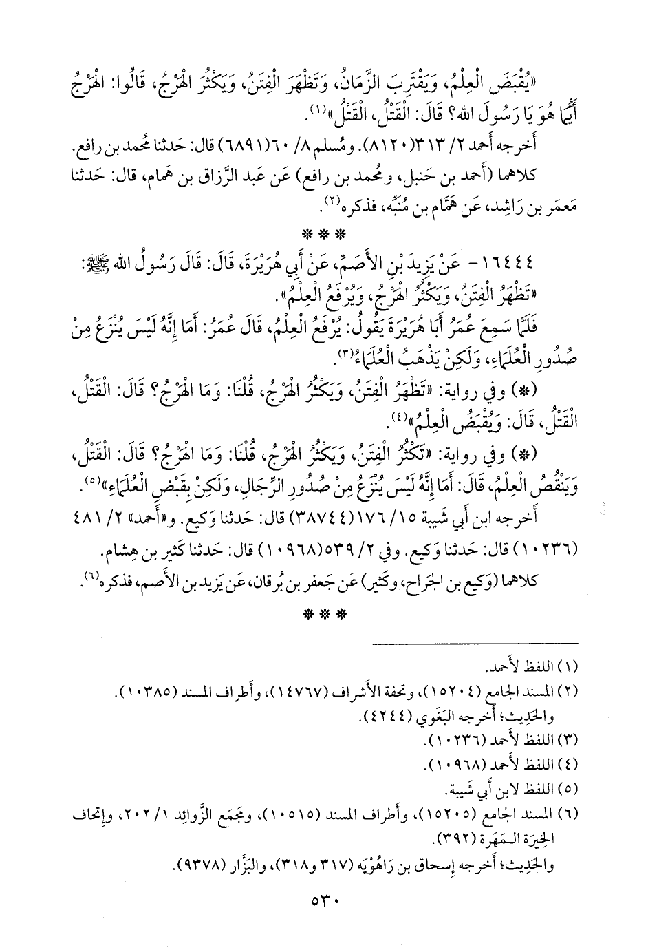 - وفي رواية: «تكثر الفتن، ويكثر الهرج، قلنا: وما الهرج؟ قال: القتل، وينقص العلم، قال: أما إنه ليس ينزع من صدور الرجال، ولكن بقبض العلماء» (¬٣).