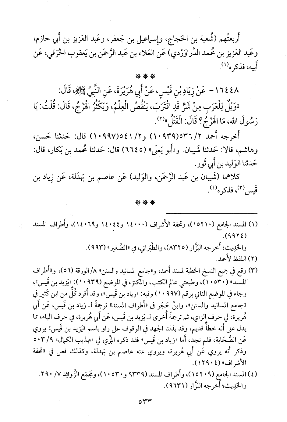 (¬٢) وقع في جميع النسخ الخطية لمسند أحمد، و «جامع المسانيد والسنن» ٨/ الورقة (٥٦)، و «أطراف المسند» (١٠٥٣٠)، وطبعتي عالم الكتب، والمكنز، في الموضع (١٠٩٣٩): «يزيد بن قيس»، وجاء في الموضع الثاني برقم (١٠٩٩٧) وفيه: «زياد بن قيس»، وقد أفرد كل من ابن كثير في «جامع المسانيد والسنن»، وابن حجر في «أطراف المسند» ترجمة لـ زياد بن قيس، عن أبي هريرة، في حرف الزاي، مما يدل على أنه خطأ قديم، ثم ترجمة أخرى لـ يزيد بن قيس، عن أبي هريرة، في حرف الياء، وقد بذلنا الجهد في الوقوف على راو باسم «يزيد بن قيس» يروي عن الصحابة، فلم نجد، أما «زياد بن قيس» فقد ذكره المِزِّي في «تهذيب الكمال» ٩/ ٥٠٣ وذكر أنه يروي عن أبي هريرة، ويروي عنه عاصم بن بهدلة.