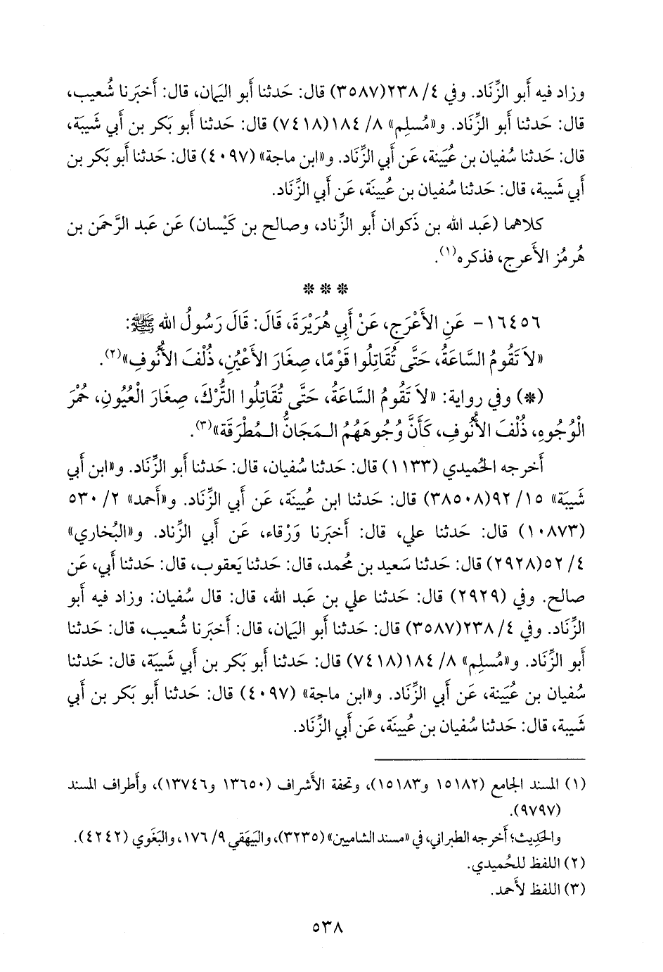 أخرجه الحُميدي (١١٣٣) قال: حدثنا سفيان، قال: حدثنا أَبو الزناد. و «ابن أبي شيبة» (٣٨٥٠٨) قال: حدثنا ابن عُيينة، عن أبي الزناد. و «أحمد» ٢/ ٥٣٠ (١٠٨٧٣) قال: حدثنا علي، قال: أخبرنا ورقاء، عن أبي الزناد. و «البخاري» ٤/ ٥٢ (٢٩٢٨) قال: حدثنا سعيد بن محمد، قال: حدثنا يعقوب، قال: حدثنا أبي، عن صالح. وفي (٢٩٢٩) قال: حدثنا علي بن عبد الله, قال: قال سفيان: وزاد فيه أَبو الزناد. وفي ٤/ ٢٣٨ (٣٥٨٧) قال: حدثنا أَبو اليمان، قال: أخبرنا شعيب، قال: حدثنا أَبو الزناد. و «مسلم» ٨/ ١٨٤ (٧٤١٨) قال: حدثنا أَبو بكر بن أبي شيبة، قال: حدثنا سفيان بن عُيينة، عن أبي الزناد. و «ابن ماجة» (٤٠٩٧) قال: حدثنا أَبو بكر بن أبي شيبة، قال: حدثنا سفيان بن عُيينة، عن أبي الزناد.