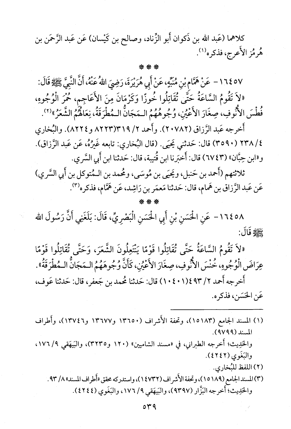 «لا تقوم الساعة حتى تقاتلوا قوما ينتعلون الشعر، وحتى تقاتلوا قوما عراض الوجوه، خنس الأنوف، صغار الأعين، كأن وجوههم المجان المطرقة».