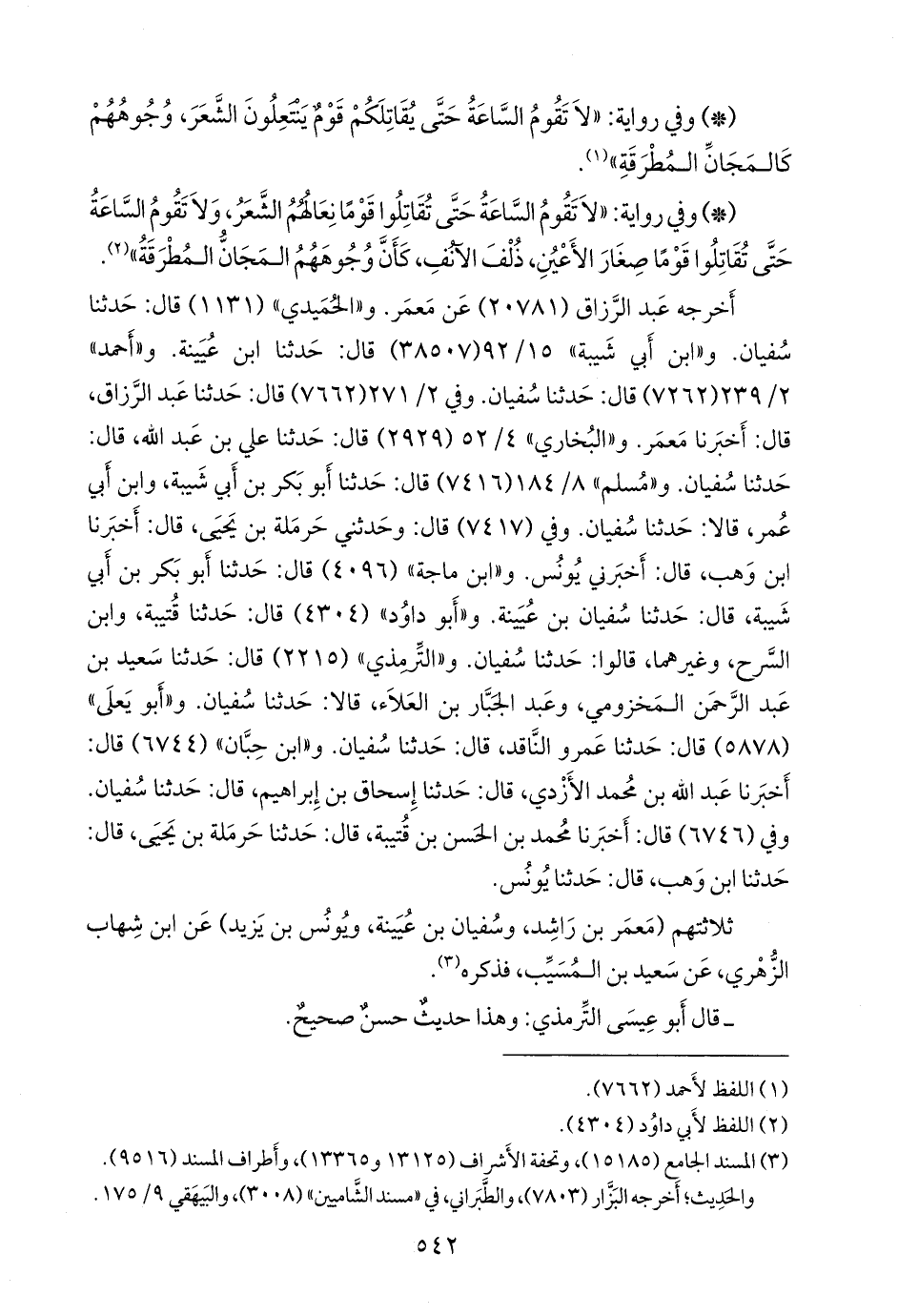 وفي (٧٤١٧) قال: وحدثني حَرملة بن يحيى، قال: أخبرنا ابن وهب, قال: أخبرني يونس. و «ابن ماجة» (٤٠٩٦) قال: حدثنا أَبو بكر بن أبي شيبة، قال: حدثنا سفيان بن عُيينة. و «أَبو داود» (٤٣٠٤) قال: حدثنا قتيبة، وابن السَّرح، وغيرهما، قالوا: حدثنا سفيان. و «التِّرمِذي» (٢٢١٥) قال: حدثنا سعيد بن عبد الرَّحمَن المخزومي، وعبد الجبار بن العلاء، قالا: حدثنا سفيان. و «أَبو يَعلى» (٥٨٧٨) قال: حدثنا عَمرو الناقد، قال: حدثنا سفيان. و «ابن حِبَّان» (٦٧٤٤) قال: أخبرنا عبد الله بن محمد الأزدي، قال: حدثنا إسحاق بن إبراهيم، قال: حدثنا سفيان. وفي (٦٧٤٦) قال: أخبرنا محمد بن الحسن بن قتيبة، قال: حدثنا حَرملة بن يحيى، قال: حدثنا ابن وهب، قال: حدثنا يونس.
